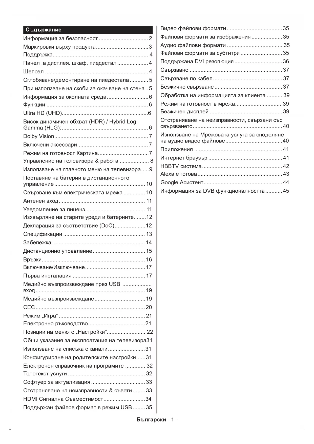 Информация за безопасност ................................ 2 Маркировки върху продукта .................................. 3 Поддръжка.............................................................. 4 Панел ,а дисплея. шкаф, пиедестал .................... 4 Щепсел ...................................................................4 Сглобяване/демонтиране на пиедестала ............ 5 При използване на скоби за окачване на стена .. 5 Информация за околната среда ........................... 6 Функции .................................................................. 6 Ultra HD (UHD) ........................................................ 6 Висок динамичен обхват (HDR) / Hybrid Log- Gamma (HLG): ........................................................ 6 Dolby Vision ............................................................. 7 Включени аксесоари .............................................. 7 Режим на готовност Картина ................................. 7 Управление на телевизора & работа ................... 8 Използване на главното меню на телевизора ..... 9 Поставяне на батерии в дистанционното управление ...........................................................10 Свързване към електрическата мрежа .............. 10 Антенен вход ........................................................ 11 Уведомление за лиценз ....................................... 11 Изхвърляне на старите уреди и батериите ........ 12 Декларация за съответствие (DoC) .................... 12 Спецификации ..................................................... 13 Забележка: ........................................................... 14 Дистанционно управление .................................. 15 Връзки ................................................................... 16 Включване/Изключване ....................................... 17 Първа инсталация ...............................................17 Медийно възпроизвеждане през USB ................... вход ....................................................................... 19 Медийно възпроизвеждане ................................. 19 CEC ....................................................................... 20 Режим „Игра” ........................................................ 21 Електронно ръководство ..................................... 21 Позиции на менюто „Настройки”......................... 22 Общи указания за експлоатация на телевизора 31 Използване на списъка с канали ........................ 31 Конфигуриране на родителските настройки ...... 31 Електронен справочник на програмите ............. 32 Телетекст услуги .................................................. 32 Софтуер за актуализация ................................... 33 Отстраняване на неизправности & съвети ........ 33 HDMI Сигнална Съвместимост ........................... 34 Поддържан файлов формат в режим USB ........ 35 Видео файлови формати .................................... 35 Файлови формати за изображения .................... 35 Аудио файлови формати .................................... 35 Файлови формати за субтитри ........................... 35 Поддържана DVI резолюция ............................... 36 Свързване ............................................................ 37 Свързване по кабел .............................................37 Безжично свързване ............................................ 37 Обработка на информацията за клиента .......... 39 Режим на готовност в мрежа ...............................39 Безжичен дисплей ...............................................39 Отстраняване на неизправности, свързани със свързването .......................................................... 40 Използване на Мрежовата услуга за споделяне на аудио видео файлове ..................................... 40 Приложения ......................................................... 41 Интернет браузър ................................................41 HBBTV система .................................................... 42 Alexa е готова .......................................................43 Google Асистент ................................................... 44 Информация за DVB функционалността ........... 45Български - 2 - Информация за безопасност BНИМАНИЕ ОПАСНОСТ ОТ ТОКОВ УДАР