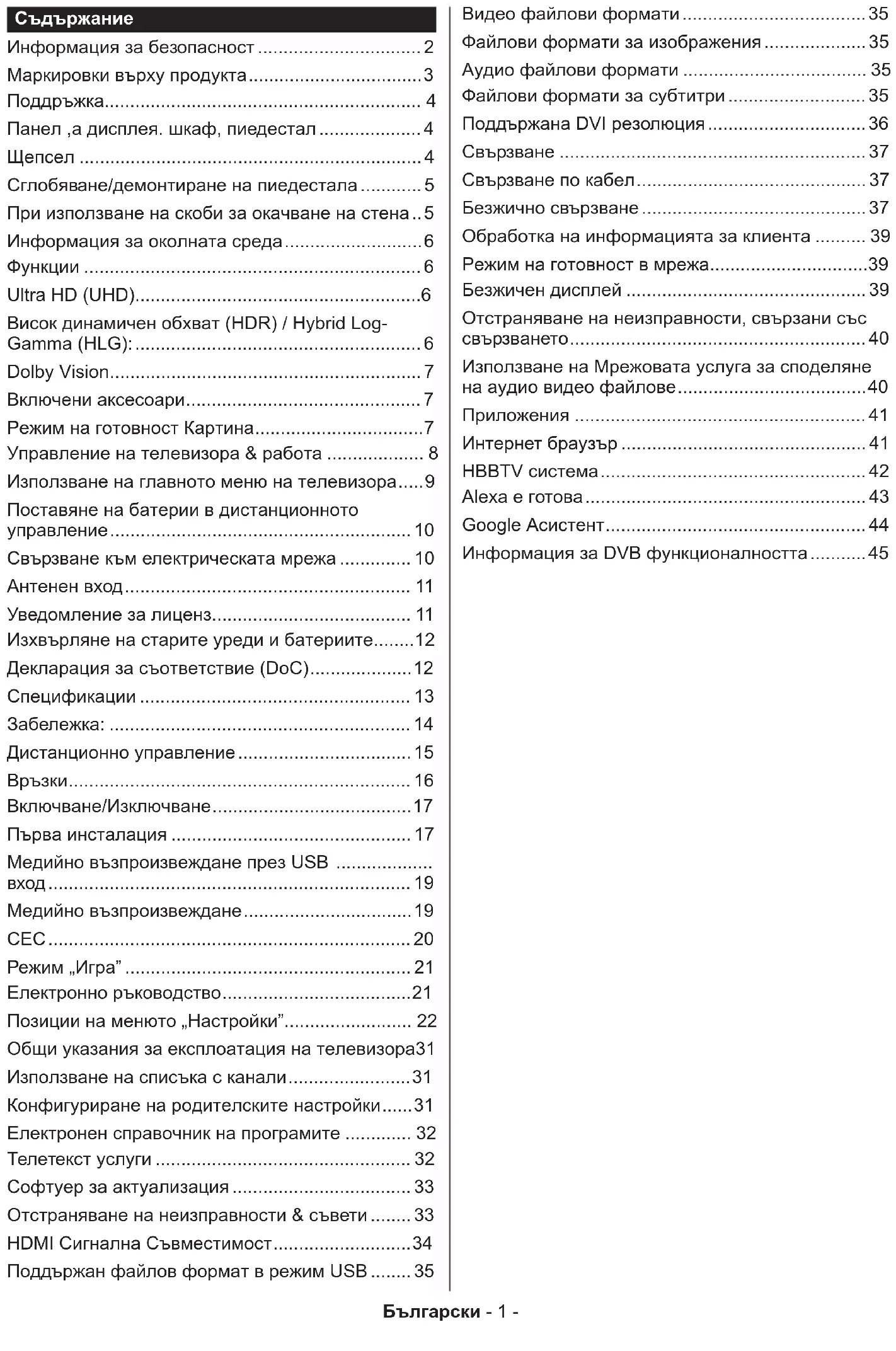 Информация за безопасност ................................ 2 Маркировки върху продукта .................................. 3 Поддръжка.............................................................. 4 Панел ,а дисплея. шкаф, пиедестал .................... 4 Щепсел ...................................................................4 Сглобяване/демонтиране на пиедестала ............ 5 При използване на скоби за окачване на стена .. 5 Информация за околната среда ........................... 6 Функции .................................................................. 6 Ultra HD (UHD) ........................................................ 6 Висок динамичен обхват (HDR) / Hybrid Log- Gamma (HLG): ........................................................ 6 Dolby Vision ............................................................. 7 Включени аксесоари .............................................. 7 Режим на готовност Картина ................................. 7 Управление на телевизора & работа ................... 8 Използване на главното меню на телевизора ..... 9 Поставяне на батерии в дистанционното управление ...........................................................10 Свързване към електрическата мрежа .............. 10 Антенен вход ........................................................ 11 Уведомление за лиценз ....................................... 11 Изхвърляне на старите уреди и батериите ........ 12 Декларация за съответствие (DoC) .................... 12 Спецификации ..................................................... 13 Забележка: ........................................................... 14 Дистанционно управление .................................. 15 Връзки ................................................................... 16 Включване/Изключване ....................................... 17 Първа инсталация ...............................................17 Медийно възпроизвеждане през USB ................... вход ....................................................................... 19 Медийно възпроизвеждане ................................. 19 CEC ....................................................................... 20 Режим „Игра” ........................................................ 21 Електронно ръководство ..................................... 21 Позиции на менюто „Настройки”......................... 22 Общи указания за експлоатация на телевизора 31 Използване на списъка с канали ........................ 31 Конфигуриране на родителските настройки ...... 31 Електронен справочник на програмите ............. 32 Телетекст услуги .................................................. 32 Софтуер за актуализация ................................... 33 Отстраняване на неизправности & съвети ........ 33 HDMI Сигнална Съвместимост ........................... 34 Поддържан файлов формат в режим USB ........ 35 Видео файлови формати .................................... 35 Файлови формати за изображения .................... 35 Аудио файлови формати .................................... 35 Файлови формати за субтитри ........................... 35 Поддържана DVI резолюция ............................... 36 Свързване ............................................................ 37 Свързване по кабел .............................................37 Безжично свързване ............................................ 37 Обработка на информацията за клиента .......... 39 Режим на готовност в мрежа ...............................39 Безжичен дисплей ...............................................39 Отстраняване на неизправности, свързани със свързването .......................................................... 40 Използване на Мрежовата услуга за споделяне на аудио видео файлове ..................................... 40 Приложения ......................................................... 41 Интернет браузър ................................................41 HBBTV система .................................................... 42 Alexa е готова .......................................................43 Google Асистент ................................................... 44 Информация за DVB функционалността ........... 45Български - 2 - Информация за безопасност BНИМАНИЕ ОПАСНОСТ ОТ ТОКОВ УДАР