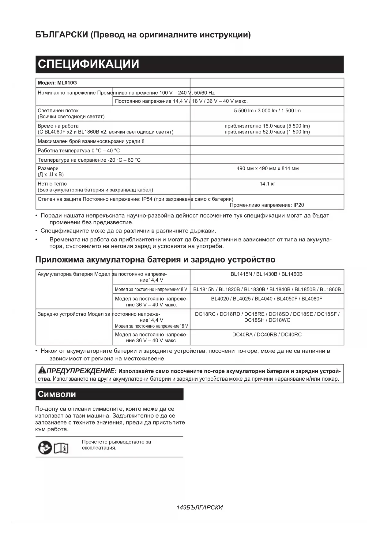 - Оригинална акумулаторна батерия и зарядно устройство на Makita ЗАБЕЛЕЖКА: Някои артикули от списъка може да са включени в комплекта на инструмента, като стандартни аксесоари. Те може да са различни в различните държави.156 HRVATSKI HRVATSKI (Originalne upute) SPECIFIKACIJE Model: ML010G Nazivni napon AC 100 V – 240 V, 50/60 Hz DC 14,4 V / 18 V / 36 V – 40 V maks. Svjetlosni tok (sve LED žarulje svijetle)