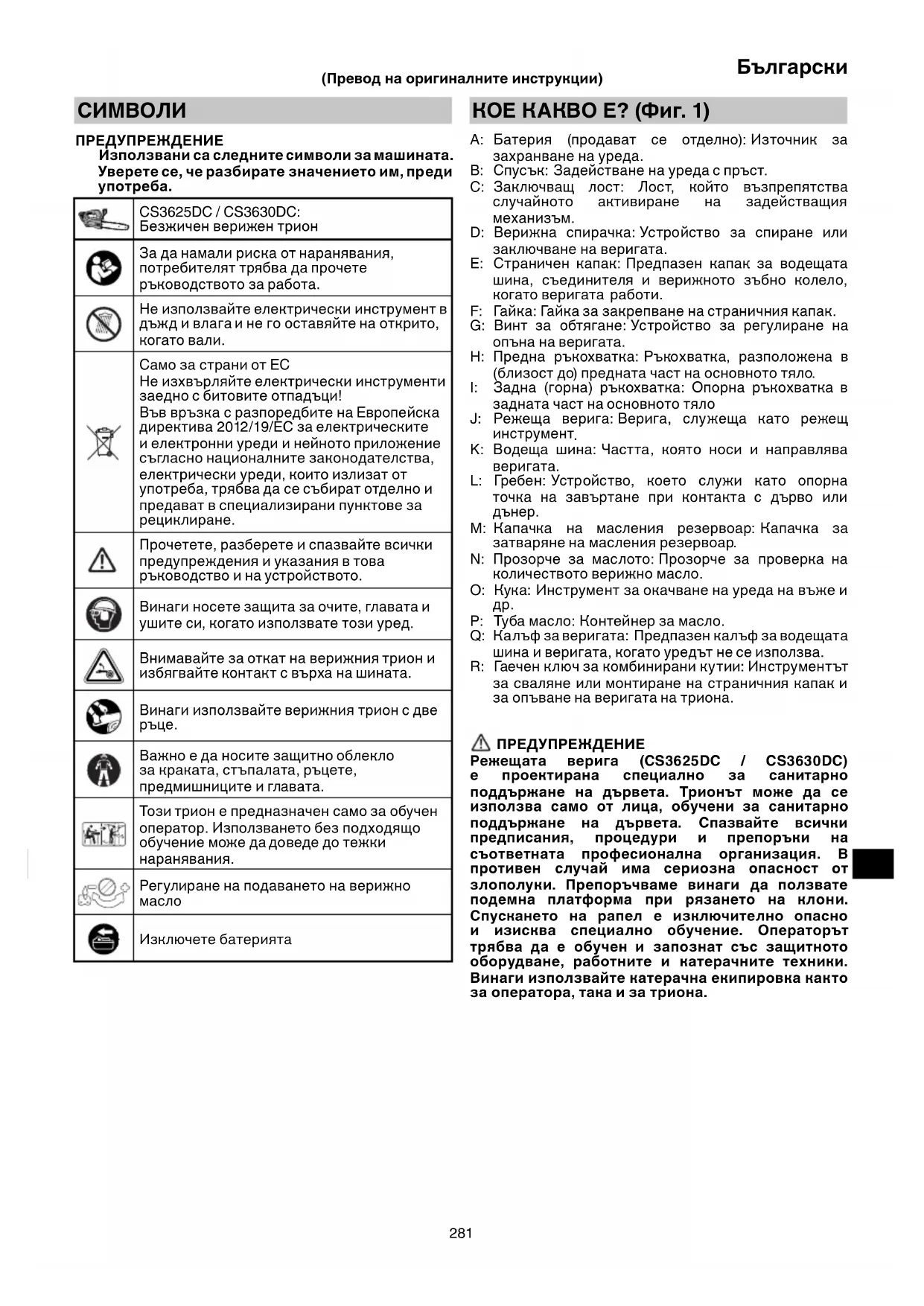 P: Туба масло: Контейнер за масло. Q: Калъф за веригата: Предпазен калъф за водещата шина и веригата, когато уредът не се използва. R: Гае ч е н ключ за комбинирани кутии: Инструментът за сваляне или монтиране на страничния капак и за опъване на веригата на триона. ПРЕДУПРЕЖДЕНИЕ Режещата верига (CS3625DC / CS3630DC) е проектирана специално за санитарно поддържане на дървета. Трионът може да се използва само от лица, обучени за санитарно поддържане на дървета. Спазвайте всички предписания, процедури и препоръки на съответната професионална организация. В противен случай има сериозна опасност от злополуки. Препоръчваме винаги да ползвате подемна платформа при рязането
