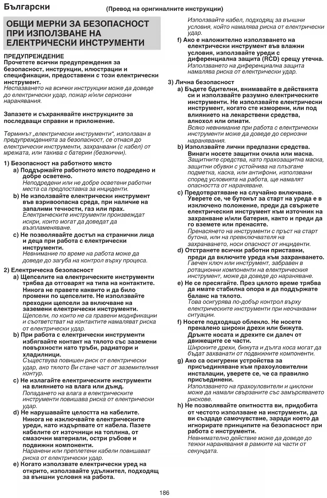 ОБЩИ МЕРКИ ЗА БЕЗОПАСНОСТ ПРИ ИЗПОЛЗВАНЕ НА ЕЛЕКТРИЧЕСКИ ИНСТРУМЕНТИ ПРЕДУПРЕЖДЕНИЕ Прочетете всички предупреждения за безопасност, инструкции, илюстрации и спецификации, предоставени с този електрически инструмент. Неспазването на всички инструкции може да доведе до електрически удар, пожар и/или сериозни наранявания. Запазете и съхранявайте инструкциите за последващи справки и приложение. Терминът „електрически инструменти“, използван в предупрежденията за безопасност, се отнася до електрически инструменти, захранвани (с кабел) от мрежата, или такива с батерии (безжични).