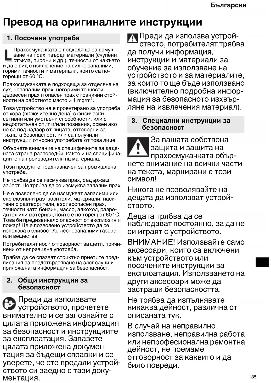Превод на оригиналните инструкции Прахосмукачката е подходяща за всмук- ване на прах, твърди материали (счупени стъкла, пирони и др.), течности от какъвто и да е вид с изключение на силно запалими, горими течности и материали, които са по- горещи от 60 °C. Прахосмукачката е подходяща за отделяне на сух, незапалим прах, негорими течности, дървесен прах и опасен прах с гранични стой- ности на работното място > 1 mg/m³. Това устройство не е проектирано за употреба от хора (включително деца) с физически, сетивни или умствени способности, или с недостатъчен опит и/или познания, освен ако не са под надзор от лицата, отговорни за тяхната безопасност, или са получили инструкции относно употребата от това лице. Обърнете внимание на специфичните за даде- ната страна разпоредби, както и на специфика- циите на производителя на материала. Този продукт е предназначен за промишлена