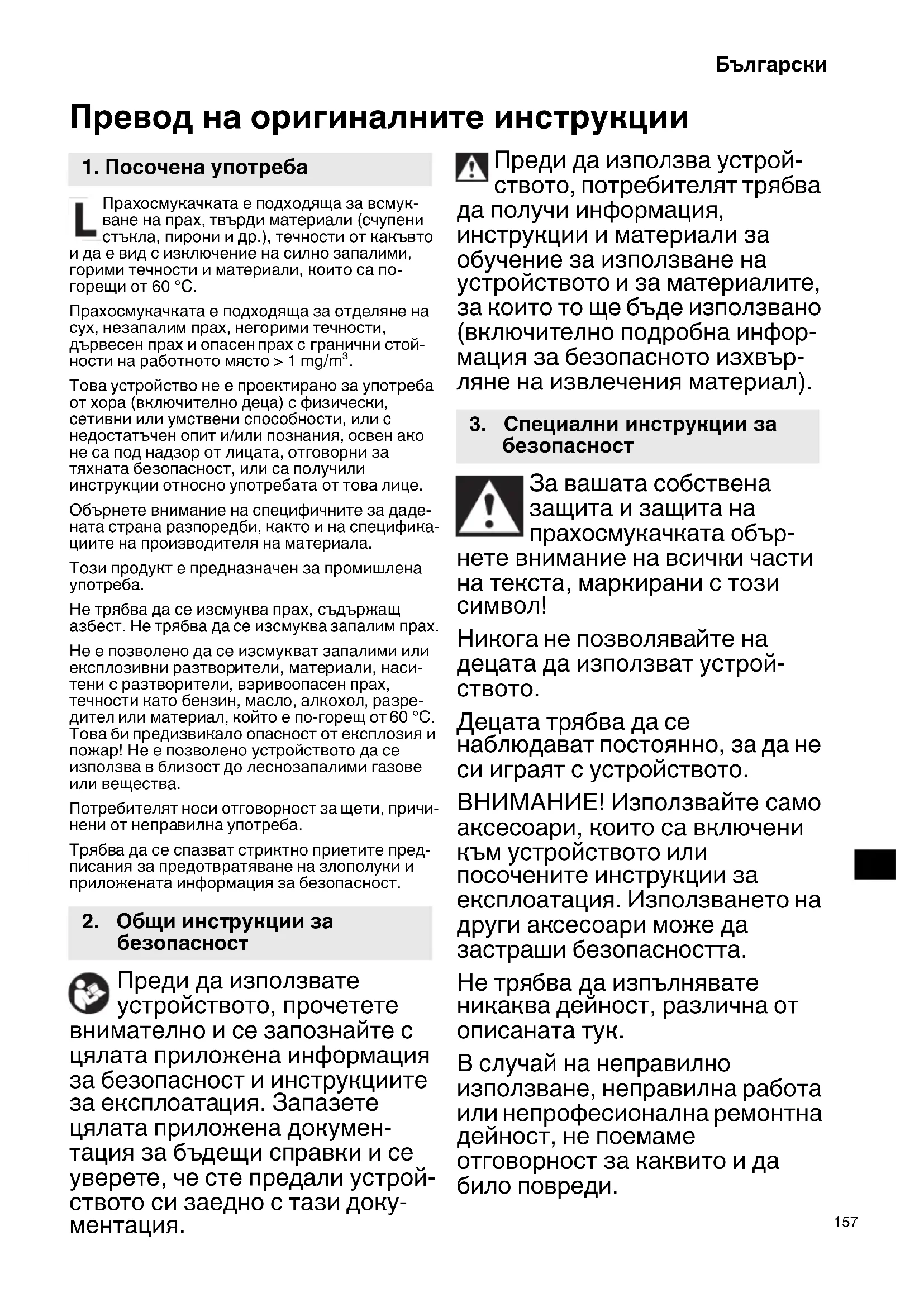 Превод на оригиналните инструкции Прахосмукачката е подходяща за всмук- ване на прах, твърди материали (счупени стъкла, пирони и др.), течности от какъвто и да е вид с изключение на силно запалими, горими течности и материали, които са по- горещи от 60 °C. Прахосмукачката е подходяща за отделяне на сух, незапалим прах, негорими течности, дървесен прах и опасен прах с гранични стой- ности на работното място > 1 mg/m³. Това устройство не е проектирано за употреба от хора (включително деца) с физически, сетивни или умствени способности, или с недостатъчен опит и/или познания, освен ако не са под надзор от лицата, отговорни за тяхната безопасност, или са получили инструкции относно употребата от това лице. Обърнете внимание на специфичните за даде- ната страна разпоредби, както и на специфика- циите на производителя на материала. Този продукт е предназначен за промишлена