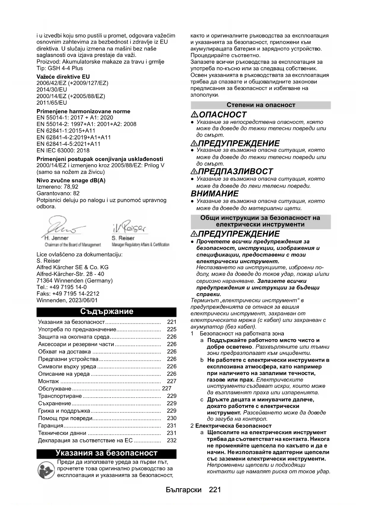 : Акумулаторна ножица за трева и храсти Тип: GSH 4-4 Plus Приложими директиви на ЕС 2006/42/ЕО (+2009/127/ЕО) 2014/30/ЕС 2000/14/ЕО (+2005/88/ЕО) 2011/65/ЕС Приложими хармонизирани стандарти EN 55014-1: 2017 + A1: 2020 EN 55014-2: 1997+A1: 2001+A2: 2008 EN 62841-1:2015+A11 EN 62841-4-2:2019+A1+A11 EN 62841-4-5:2021+A11 EN IEC 63000: 2018 Приложима процедура за оценяване на съответствието 2000/14/ЕО и изменена с 2005/88/ЕО: приложение V (само с нож за храсти) Ниво на звукова мощност dB(A) Измерено: 78,92 Гарантирано: 82 Подписващите лица действат от името