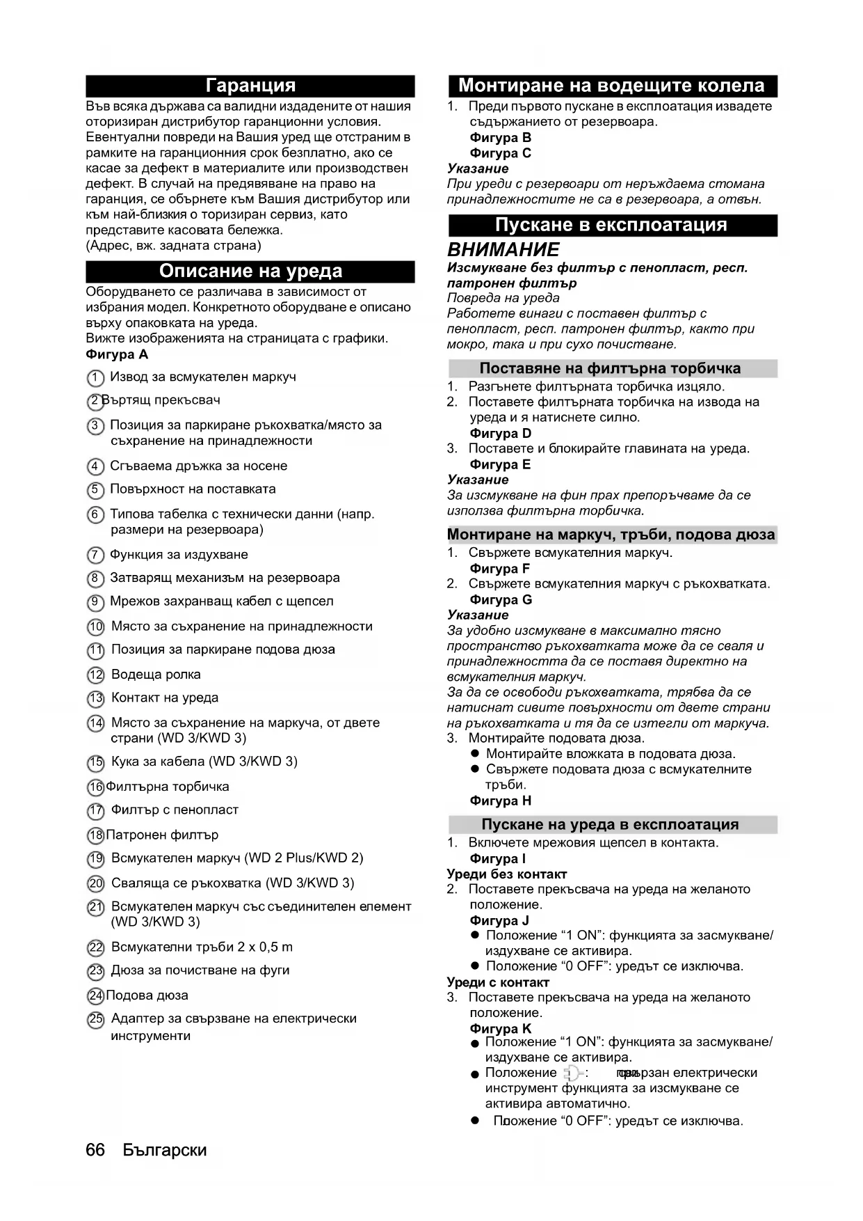 торизиран сервиз, като представите касовата бележка. (Адрес, вж. задната страна) Описание на уреда Оборудването се различава в зависимост от избрания модел. Конкретното оборудване е описано върху опаковката на уреда. Вижте изображенията на страницата с графики. Фигура A 1 Извод за всмукателен маркуч 2 Въртящ прекъсвач 3 Позиция за паркиране ръкохватка/място за съхранение на принадлежности 4 Сгъваема дръжка за носене 5 Повърхност на поставката 6 Типова табелка с технически данни (напр. размери на резервоара) 7 Функция за издухване 8 Затварящ механизъм на резервоара 9 Мрежов захранващ кабел с щепсел 10 Място за съхранение на принадлежности 11 Позиция за паркиране подова дюза 12 Водеща ролка 13 Контакт на уреда 14 Място за съхранение на маркуча, от двете страни (WD 3/KWD 3) 15 Кука за кабела (WD 3/KWD 3) 16 Филтърна торбичка 17 Филтър с пенопласт 18 Патронен филтър 19 Всмукателен маркуч (WD 2 Plus/KWD 2) 20 Сваляща се ръкохватка (WD 3/KWD 3) 21 Всмукателен маркуч със съединителен елемент (WD 3/KWD 3) 22 Всмукателни тръби 2 x 0,5 m 23 Дюза за почистване на фуги 24 Подова дюза 25 Адаптер за свързване на електрически инструменти Монтиране на водещите колела