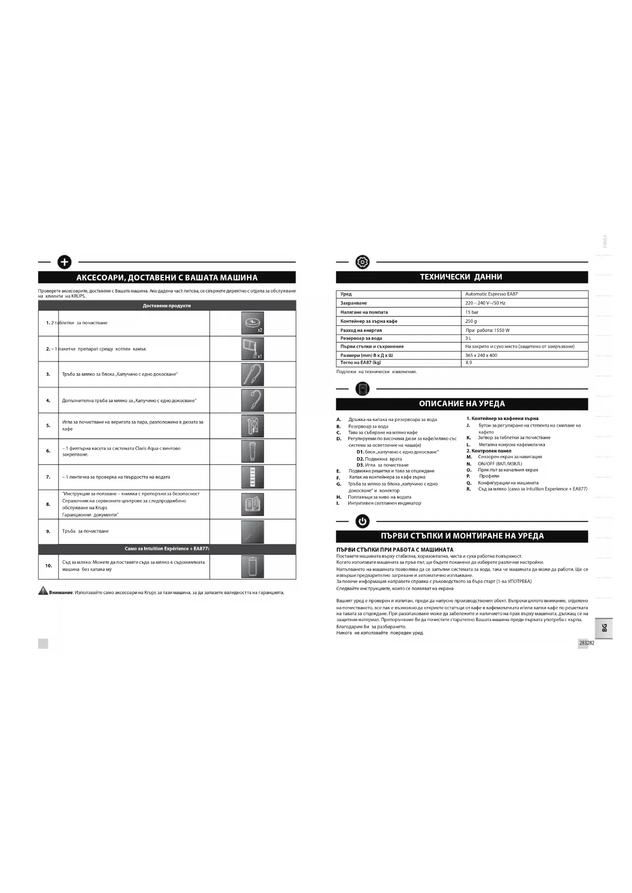 j. Извършване на премахване на котлен камък k. Почистване на дюзата за мляко ВАЖНА ИНФОРМАЦИЯ ЗА ПРОДУКТА Прочетете внимателно ръководството за потребителя и книжката „Инструкции за безопасност“, преди да използвате уреда за първи път, и ги запазете: използването на уреда в несъответствие с инструкциите освобождава KRUPS от всякаква отговорност.283282
