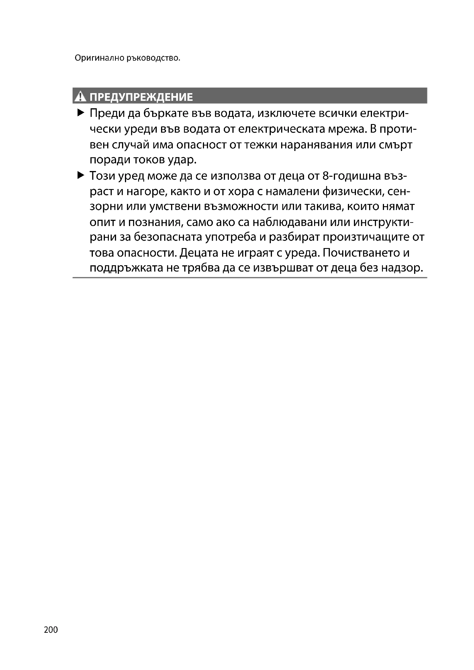 ПРЕДУПРЕЖДЕНИЕ Преди да бъркате във водата, изключете всички електри- чески уреди във водата от електрическата мрежа. В проти- вен случай има опасност от тежки наранявания или смърт поради токов удар. Този уред може да се използва от деца от 8-годишна въз- раст и нагоре, както и от хора с намалени физически, сен- зорни или умствени възможности или такива, които нямат опит и познания, само ако са наблюдавани или инструкти- рани за безопасната употреба и разбират произтичащите от това опасности. Децата не играят с уреда. Почистването и поддръжката не трябва да се извършват от деца без надзор.BG