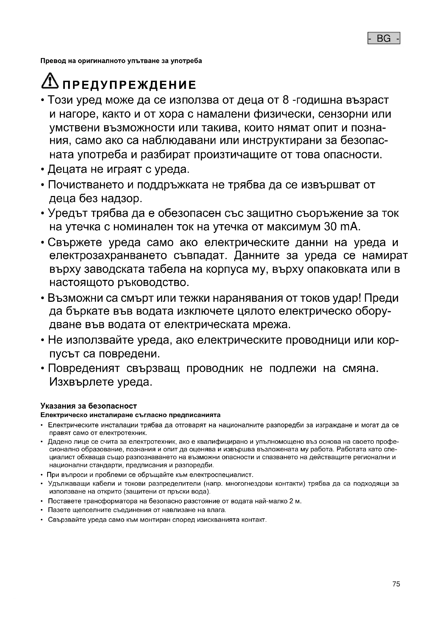 - Възможни са смърт или тежки наранявания от токов удар! Преди да бъркате във водата изключете цялото електрическо обору- дване във водата от електрическата мрежа.