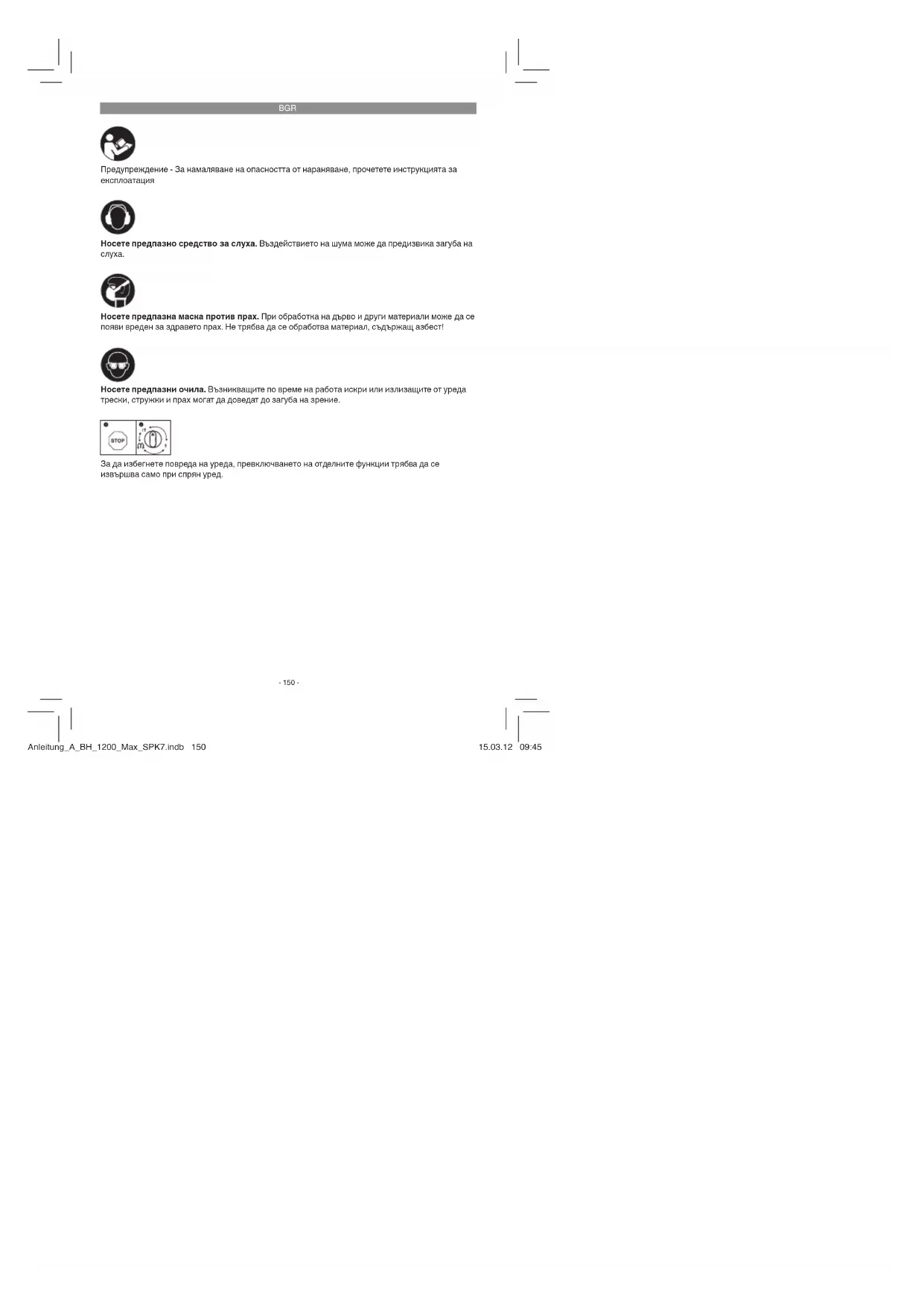 Носете предпазни очила. Възникващите по време на работа искри или излизащите от уреда трески, стружки и прах могат да доведат до загуба на зрение. Носете предпазна маска против прах. При обработка на дърво и други материали може да се появи вреден за здравето прах. Не трябва да се обработва материал, съдържащ азбест! За да избегнете повреда на уреда, превключването на отделните функции трябва да се извършва само при спрян уред. Anleitung_A_BH_1200_Max_SPK7.indb 150Anleitung_A_BH_1200_Max_SPK7.indb 150 15.03.12 09:4515.03.12 09:45BGR
