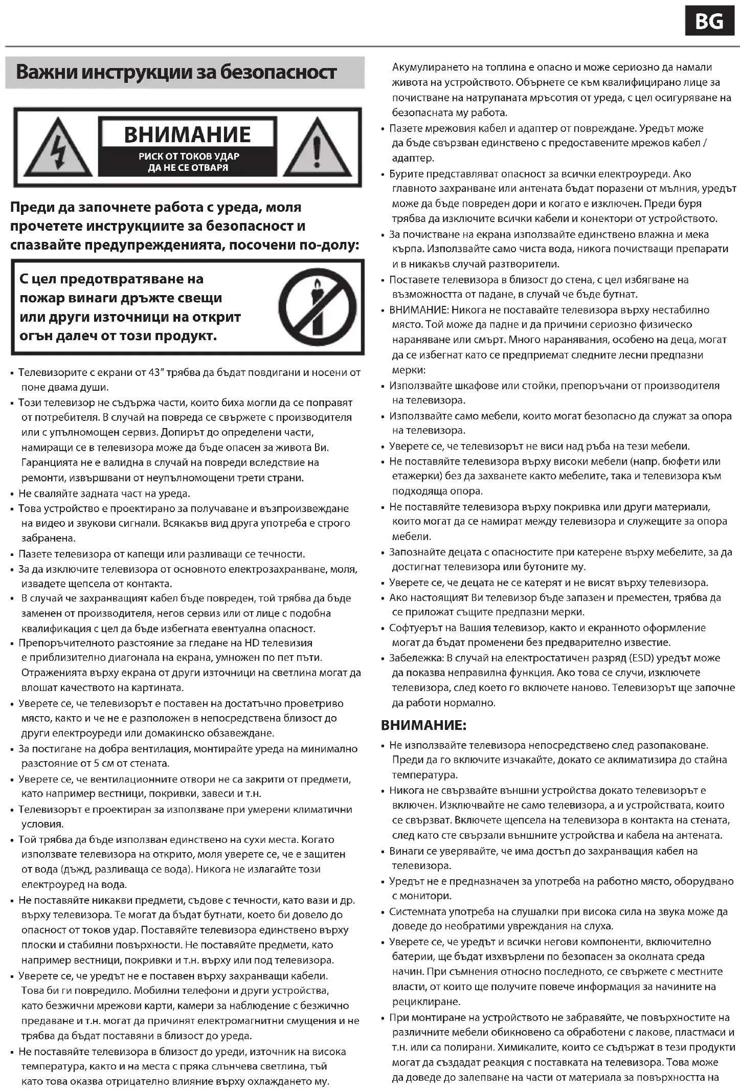 - Този телевизор не съдържа части, които биха могли да се поправят от потребителя. В случай на повреда се свържете с производителя или с упълномощен сервиз. Допирът до определени части, намиращи се в телевизора може да бъде опасен за живота Ви. Гаранцията не е валидна в случай на повреди вследствие на ремонти, извършвани от неупълномощени трети страни.