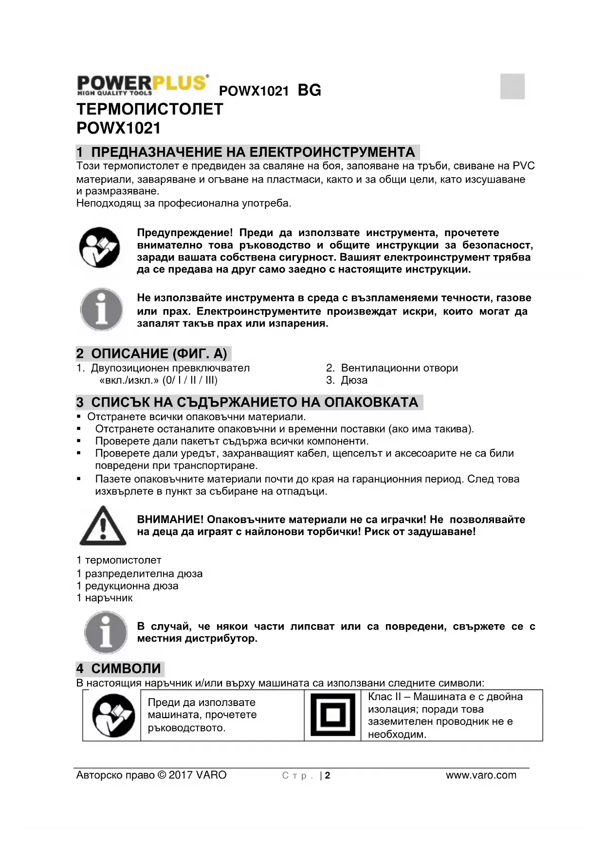 - 12 ОКОЛНА СРЕДА POWX1021 BG Авторско право © 2017 VARO С т р . | 2 www.varo.com ТЕРМОПИСТОЛЕТ POWX1021 1 ПРЕДНАЗНАЧЕНИЕ НА ЕЛЕКТРОИНСТРУМЕНТА Този термопистолет е предвиден за сваляне на боя, запояване на тръби, свиване на РVС материали, заваряване и огъване на пластмаси, както и за общи цели, като изсушаване и размразяване. Неподходящ за професионална употреба. Предупреждение! Преди да използвате инструмента, прочетете внимателно това ръководство и общите инструкции за безопасност, заради вашата собствена сигурност. Вашият електроинструмент трябва да се предава на друг само заедно с настоящите инструкции. Не използвайте инструмента в среда с възпламеняеми течности, газове или прах. Електроинструментите произвеждат искри, които могат да запалят такъв прах или изпарения. 2 ОПИСАНИЕ (ФИГ. A) p. 9