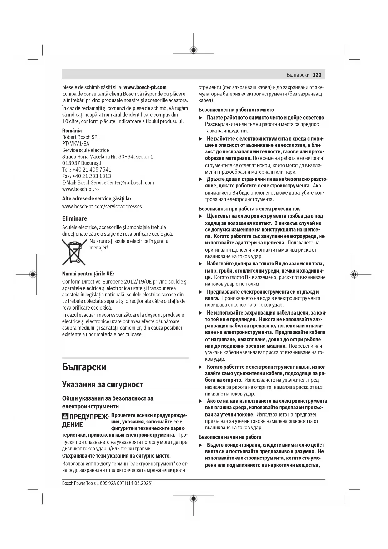 u Когато работите с електроинструмент навън, изпол- звайте само удължителни кабели, подходящи за ра- бота на открито. Използването на удължител, пред- назначен за работа на открито, намалява риска от въз- никване на токов удар. u Ако се налага използването на електроинструмента във влажна среда, използвайте предпазен прекъс- вач за утечни токове. Използването на предпазен прекъсвач за утечни токове намалява опасността от възникване на токов удар. Безопасен начин на работа u Бъдете концентрирани, следете внимателно дейст- вията си и постъпвайте предпазливо и разумно. Не използвайте електроинструмента, когато сте умо- рени или под влиянието на наркотични вещества, Bosch Power Tools 1 609 92A C9T | (14.05.2025)124 | Български алкохол или упойващи лекарства. Един миг разсея- ност при работа с електроинструмент може да има за последствие изключително тежки наранявания. u Работете с предпазващо работно облекло. Винаги носете предпазни очила. Носенето на подходящи за ползвания електроинструмент и извършваната дей- ност лични предпазни средства, като дихателна маска, здрави плътнозатворени обувки със стабилен грай- фер, защитна каска или шумозаглушители (антифо- ни), намалява риска от възникване на трудова злопо-