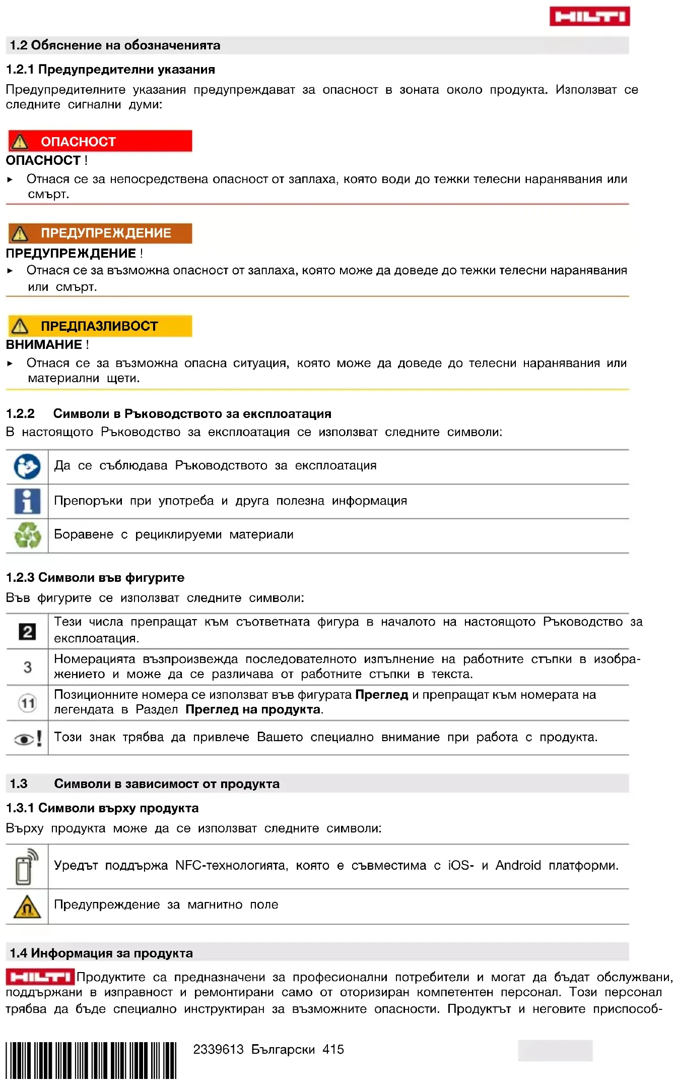 - Не работете с продукта при наличие на повреди и/или смущения във функциите. Незабавно предайте продукта в сервиз на Hilti за ремонт.