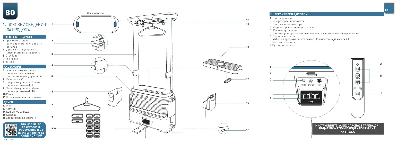 затваряйте затвора. По избор: За да поставите продукта в положение за съхранение, дезактивирайте ключалките. Натиснете дръжките за регулиране на височината на стълбовете, като в същото време ги натискате, за да се спуснат надолу. Вдигнете затвора. BG BG122 123 Избраното време и/или броят щипки за опъване не са подходящи за дрехата(ите).Рестартирайте 30-минутна програма STEAM (ПАРА), закопчайте копчетата на дрехата догоре, където е приложимо, и помислете дали да не използвате щипки за опъване на Вашата дреха, ако е възможно (вижте раздел „Как да разположа дрехите си?“)Използвали сте щипки за опъване на дреха, която лесно губи формата си.Отново изперете дрехите си. В повечето случаи това е достатъчно, за да възвърнат първоначалната си форма. В бъдеще използвайте Care For You за тази дреха, без да поставяте щипки за опъване.Цикълът на сушене в края на програмата не е завършил.– Стартирайте 10-минутна програма за сушене, изсушете с кърпа, или оставете да изсъхне естествено.Затворът не е разположен правилно. Уверете се, че затворът е правилно захванат в горната част на продукта.Дистанционното управление не е насочено към инфрачервения приемател или батерията му е изтощена.Насочете дистанционното управление към инфрачервения приемател в долната част на продукта и проверете батериите му.Стълбовете не са повдигнати достатъчно високо, за да се активира заключващият механизъм.Повдигнете стълбовете до максималната височина, за да активирате заключващия механизъм. Резервоарът е празен или е разположен неправилно.Напълнете контейнера за вода и проверете дали е захванат правилно.След няколко минути уредът се изключва автоматично, за да пести енергия.Можете да включите уреда си отново с помощта на дистанционното управление.Дрехите Ви са прекалено мокри. Центрофугирайте дрехите си, преди да ги поставите в Care For You.Не сте оставили достатъчно пространство между Care For You и стената по време на употреба, стаята не е достатъчно вентилирана или не сте затворили затвора докрай.Преместете Care For You на разстояние най-малко 50cm от стената по време на употреба или поставете уреда в по-голямо помещение с по-добра вентилация и по-умерена температура. Уверете се, че затворът е правилно затворен. CFY СИМВОЛИ ЗА ПРАНЕСамо ръчно пране Нормално машинно пране Програма за пране на синтетични дрехи Програма за пране на деликатни дрехи Да не се пере СИМВОЛИ ЗА СУШЕНЕ В СУШИЛНЯДопуска се сушене в сушилня Внимателно сушене