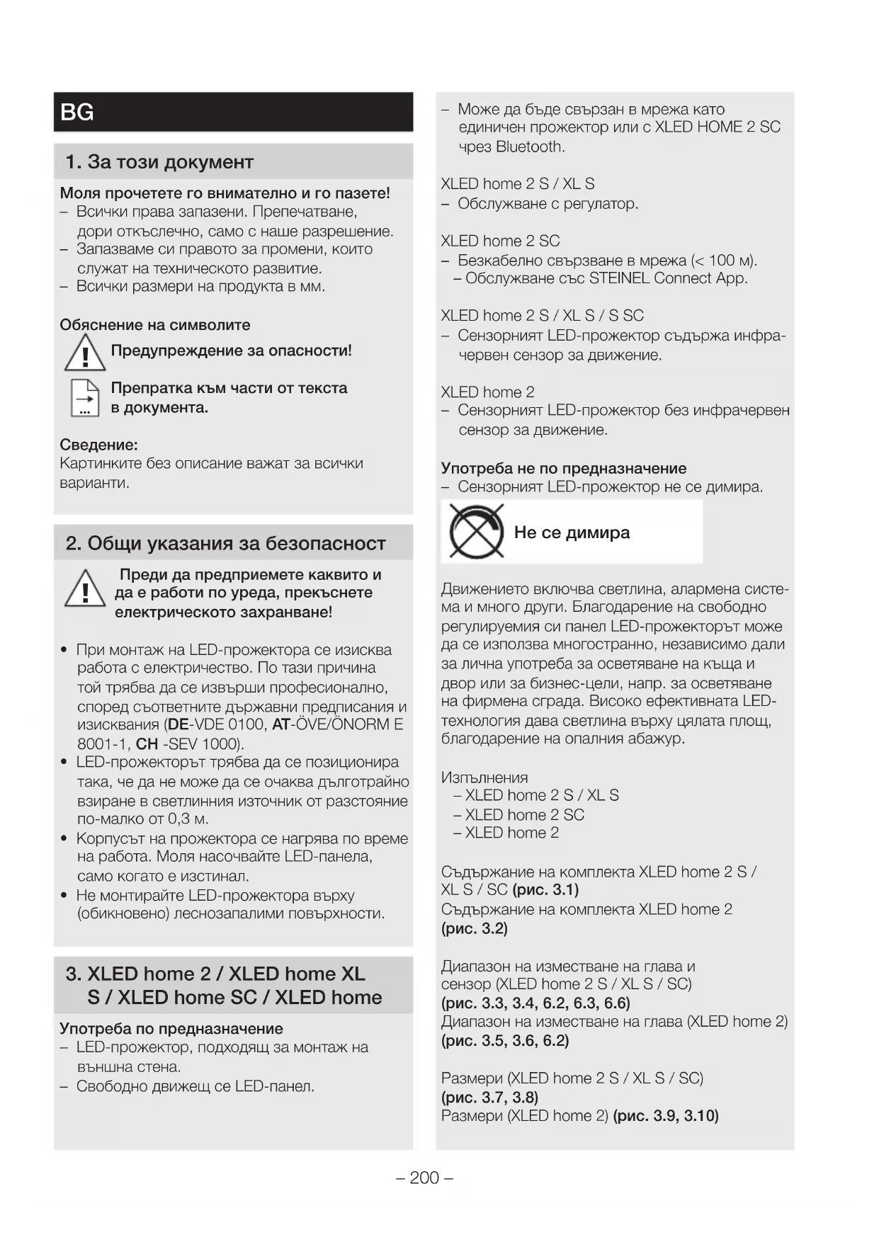 – XLEDhome2 S/XL S – XLEDhome2SC – XLEDhome2 Съдържание на комплекта XLED home 2 S/ XL S/SC (рис.3.1) Съдържание на комплекта XLEDhome2 (рис. 3.2) Диапазон на изместване на глава и сензор (XLED home 2 S/XL S/SC) (рис.3.3,3.4,6.2,6.3,6.6) Диапазон на изместване на глава (XLEDhome2) (рис.3.5,3.6,6.2) Размери (XLED home 2 S/XL S/SC) (рис.3.7,3.8) Размери (XLEDhome2) (рис.3.9,3.10)– 201 – Преглед на уреда (XLED home 2 S/XL S/SC) (рис.3.11) A LED-панел B Корпус C Стойка за стена D Сензор E Настройка на времето (XLED home 2 S/XLED home2XL S) F Настройка на светлочувствителността (XLED home 2 S/XLEDhome 2 XL S) Преглед на уреда (XLEDhome2) (рис.3.12) A LED-панел B Корпус C Стойка за стена Разпределение на светлината (рис. 3.13)