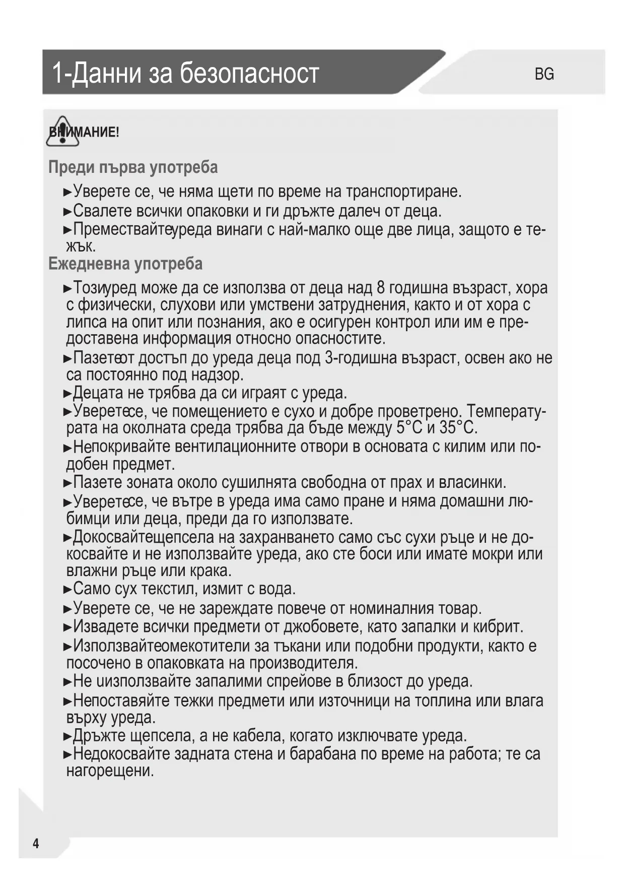 се, че вътре в уреда има само пране и няма домашни лю- бимци или деца, преди да го използвате. ▶ Докосвайте щепсела на захранването само със сухи ръце и не до- косвайте и не използвайте уреда, ако сте боси или имате мокри или влажни ръце или крака. ▶ Само сух текстил, измит с вода. ▶ Уверете се, че не зареждате повече от номиналния товар. ▶ Извадете всички предмети от джобовете, като запалки и кибрит. ▶ Използвайте омекотители за тъкани или подобни продукти, както е посочено в опаковката на производителя. ▶ Не uизползвайте запалими спрейове в близост до уреда.