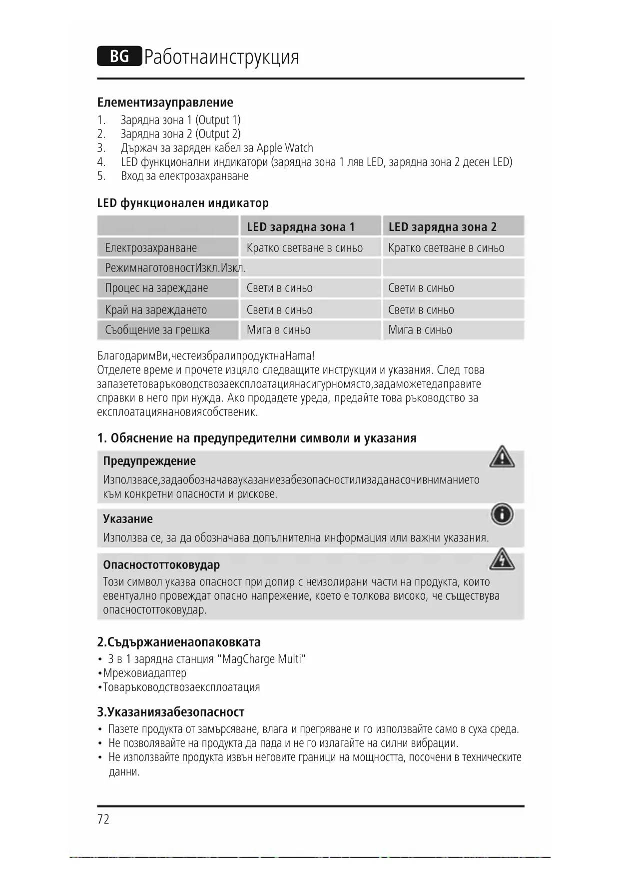 LED функционалениндикатор LED зарядназона 1LED зарядна зона 2 Електрозахранване Кратко светване всиньо Кратко светване всиньо Режим на готовност Изкл. Изкл. Процес на зареждане Свети всиньо Свети всиньо Край на зареждането Свети всиньо Свети всиньо Съобщение за грешка Мига всиньо Мига всиньо Благодарим Ви, че сте избрали продукт на Hama! Отделете време ипрочете изцяло следващите инструкции иуказания. След това запазете това ръководство за експлоатация на сигурно място, за да можете да правите справки внего при нужда. Ако продадете уреда, предайте това ръководство за експлоатация на новия собственик.