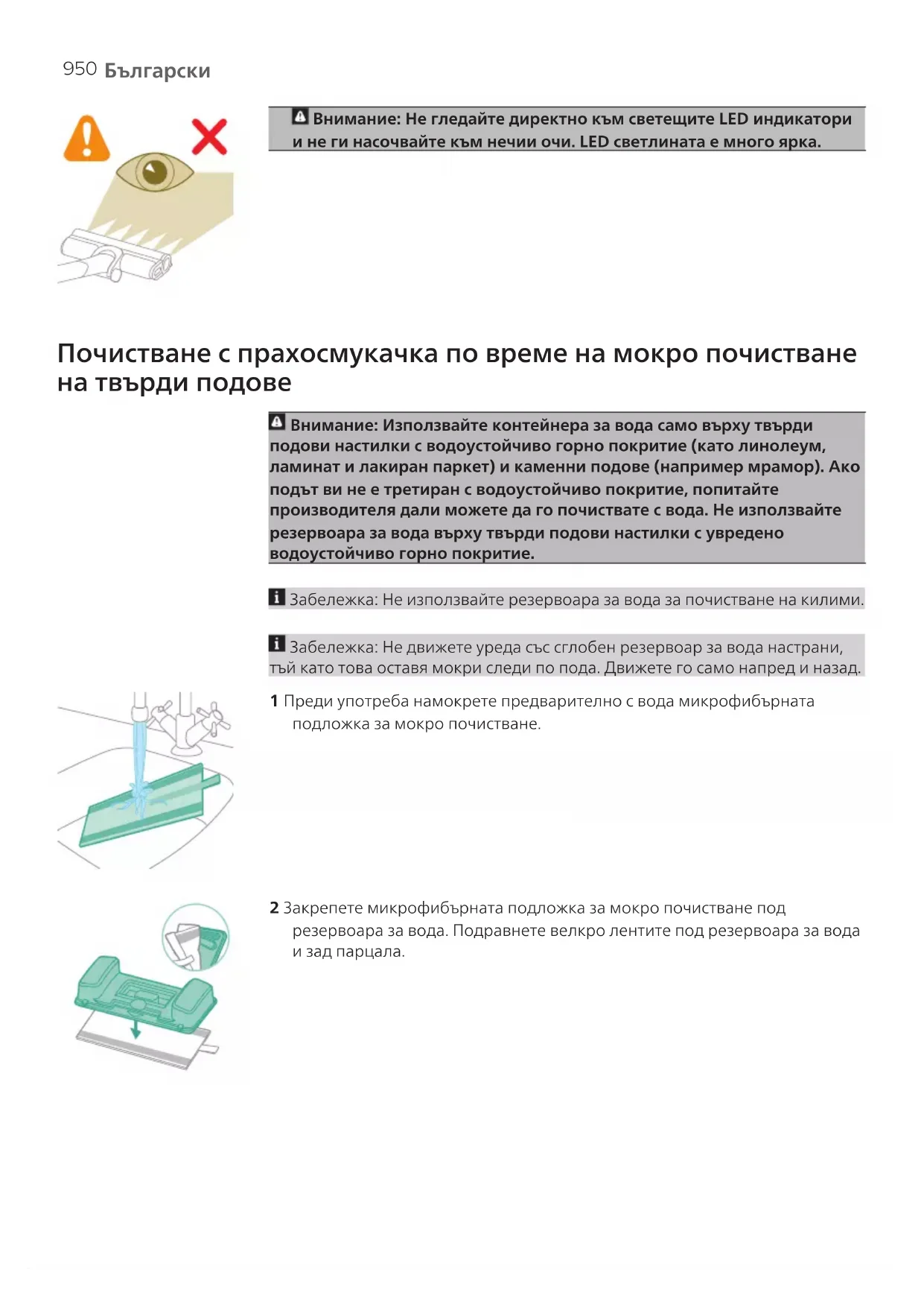 Забележка: Модулът за вода не е подходящ за меки подове, като например килим. Забележка: Не използвайте накрайника за вода за почистване, без да сте поставили на място резервоара за вода. Внимание: Модулът за вода не трябва да се използва за събиране на локви. Съвети и друга важна информация