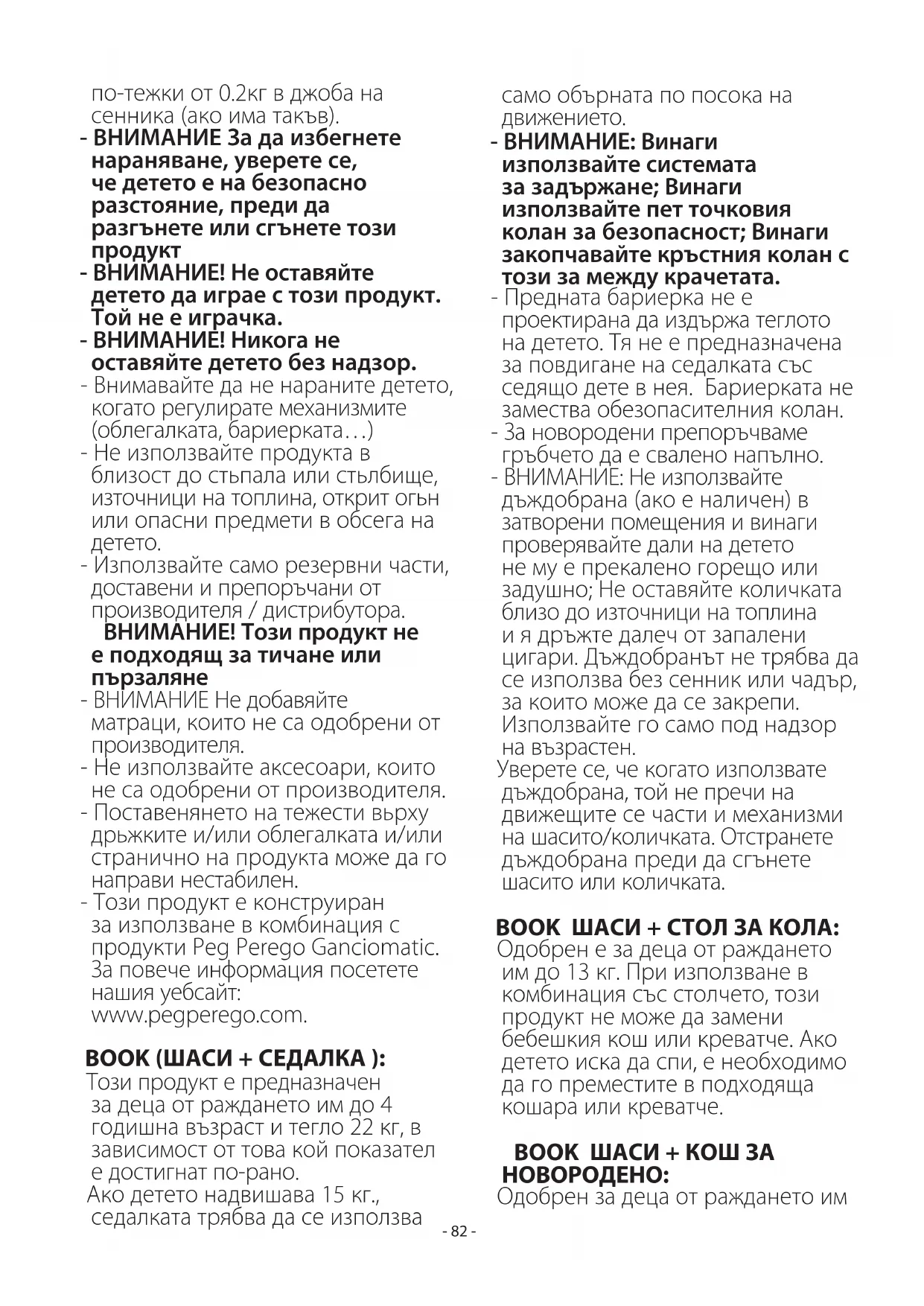 - ВНИМАНИЕ Не добавяйте матраци, които не са одобрени от производителя. - Не използвайте аксесоари, които не са одобрени от производителя. - Поставенянето на тежести вьрху дрьжките и/или облегалката и/или странично на продукта може да го направи нестабилен. - Този продукт е конструиран за използване в комбинация с продукти Peg Perego Ganciomatic. За повече информация посетете нашия уебсайт: www.pegperego.com. BOOK (ШАСИ + СЕДАЛКА ): Този продукт е предназначен за деца от раждането им до 4 годишна възраст и тегло 22 кг, в зависимост от това кой показател е достигнат по-рано. Ако детето надвишава 15 кг., седалката трябва да се използва само обърната по посока на движението. - ВНИМАНИЕ: Винаги използвайте системата за задържане; Винаги използвайте пет точковия колан за безопасност; Винаги закопчавайте кръстния колан с този за между крачетата. - Предната бариерка не е проектирана да издържа теглото на детето. Тя не е предназначена за повдигане на седалката със седящо дете в нея. Бариерката не замества обезопасителния колан. - За новородени препоръчваме гръбчето да е свалено напълно. - ВНИМАНИЕ: Не използвайте дъждобрана (ако е наличен) в затворени помещения и винаги проверявайте дали на детето не му е прекалено горещо или задушно; Не оставяйте количката близо до източници на топлина и я дръжте далеч от запалени цигари. Дъждобранът не трябва да се използва без сенник или чадър, за които може да се закрепи. Използвайте го само под надзор на възрастен. Уверете се, че когато използвате дъждобрана, той не пречи на движещите се части и механизми на шасито/количката. Отстранете дъждобрана преди да сгънете шасито или количката. BOOK ШАСИ + СТОЛ ЗА КОЛА: Одобрен е за деца от раждането им до 13 кг. При използване в комбинация със столчето, този продукт не може да замени бебешкия кош или креватче. Ако детето иска да спи, е необходимо да го преместите в подходяща кошара или креватче. BOOK ШАСИ + КОШ ЗА НОВОРОДЕНО: Одобрен за деца от раждането им- 83 - до достигане на 9 кг. При използване в съчетание с коша, този продукт е подходящ за дете, което не може да седи самостоятелно, да се преобръща и не може да се надига на колене и ръце. Максимално тегло на детето: 9кг. По време на употреба, дръжката за пренасяне (ако има такава) трябва да е извън тялото на коша и извън обсега на детето. Илюстрации, на които са изобразени елементи от тъканите може да не съ ответстват на колекцията, която сте поръчали. За по-подробна информация, посетете нашия уебсайт: www.pegperego.com.
