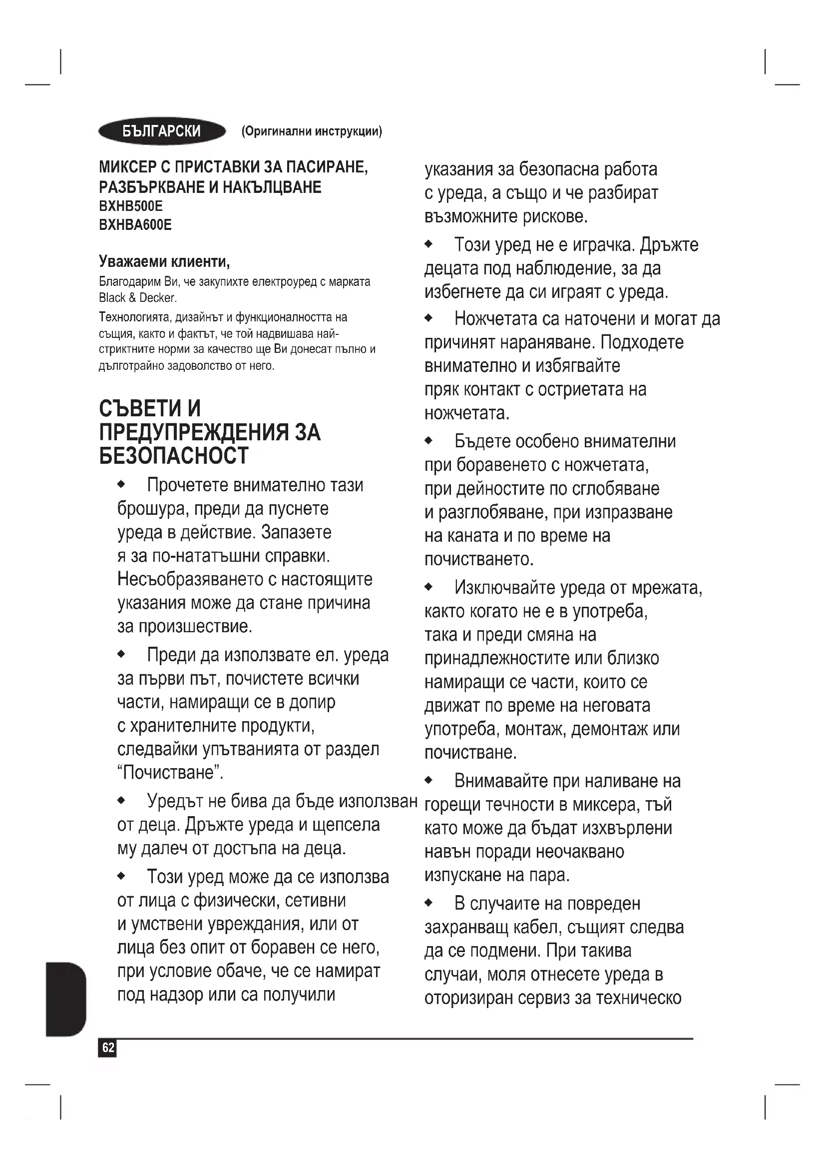 МИКСЕР С ПРИСТАВКИ ЗА ПАСИРАНЕ, РАЗБЪРКВАНЕ И НАКЪЛЦВАНЕ BXHB500E BXHBA600E Уважаеми клиенти, Благодарим Ви, че закупихте електроуред с марката Black & Decker. Технологията, дизайнът и функционалността на същия, както и фактът, че той надвишава най- стриктните норми за качество ще Ви донесат пълно и дълготрайно задоволство от него.