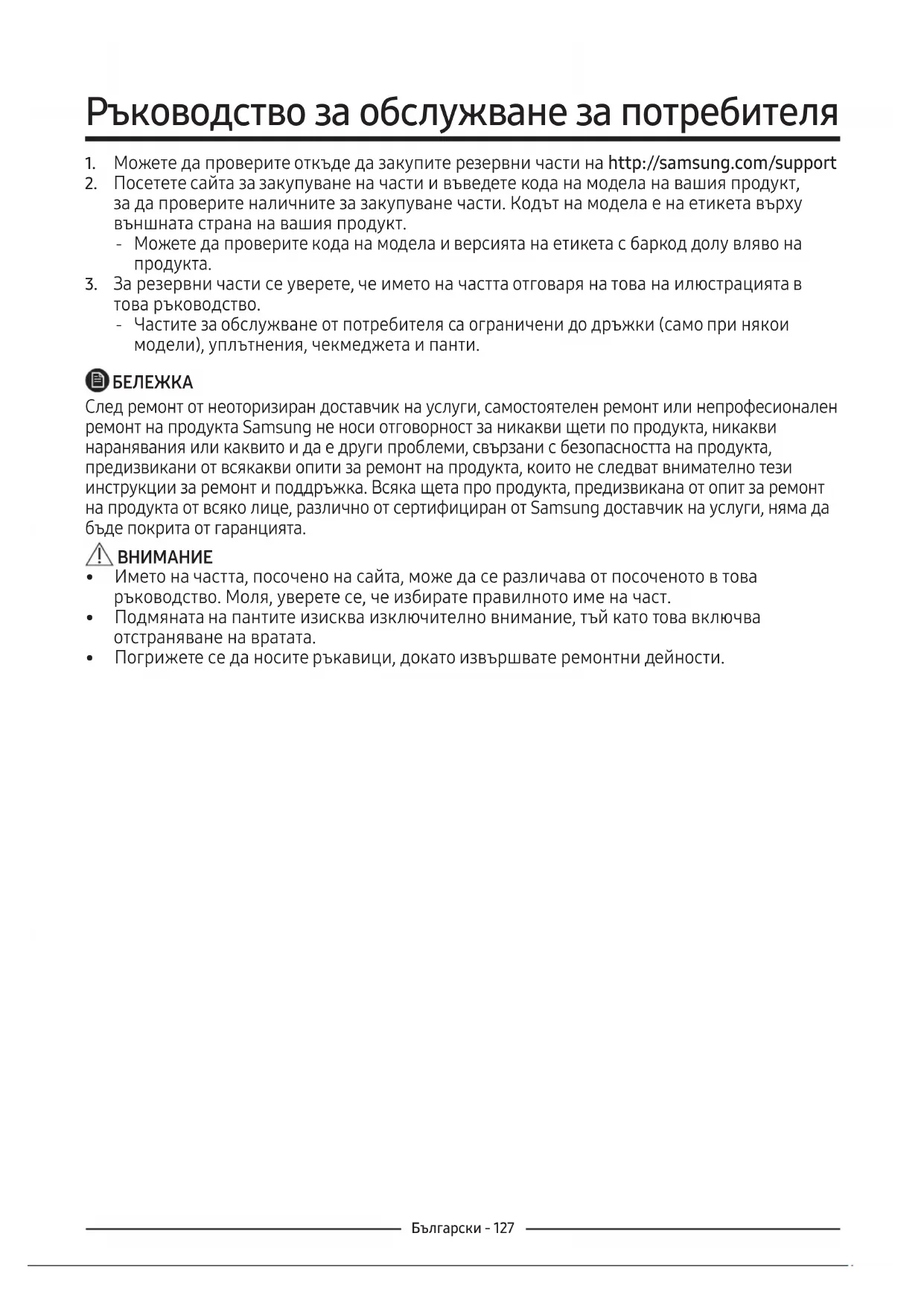1. Можете да проверите откъде да закупите резервни части на http://samsung.com/support