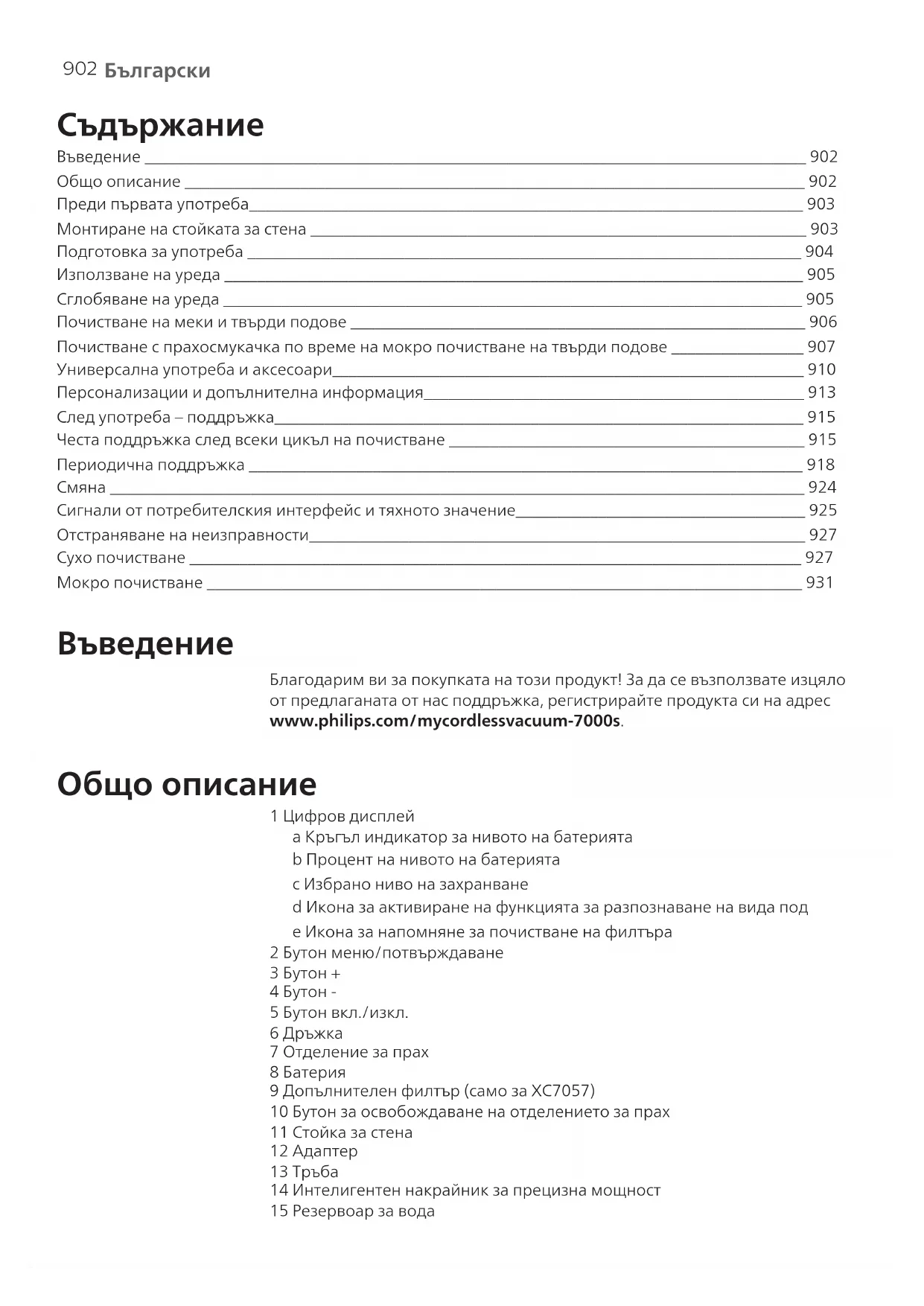 Благодарим ви за покупката на този продукт! За да се възползвате изцяло от предлаганата от нас поддръжка, регистрирайте продукта си на адрес www.philips.com/mycordlessvacuum-7000s. Общо описание 1 Цифров дисплей a Кръгъл индикатор за нивото на батерията b Процент на нивото на батерията c Избрано ниво на захранване d Икона за активиране на функцията за разпознаване на вида под e Икона за напомняне за почистване на филтъра 2 Бутон меню/потвърждаване 3 Бутон + 4 Бутон - 5 Бутон вкл./изкл. 6 Дръжка 7 Отделение за прах 8 Батерия 9 Допълнителен филтър (само за XC7057) 10 Бутон за освобождаване на отделението за прах 11 Стойка за стена 12 Адаптер 13 Тръба 14 Интелигентен накрайник за прецизна мощност 15 Резервоар за вода903
