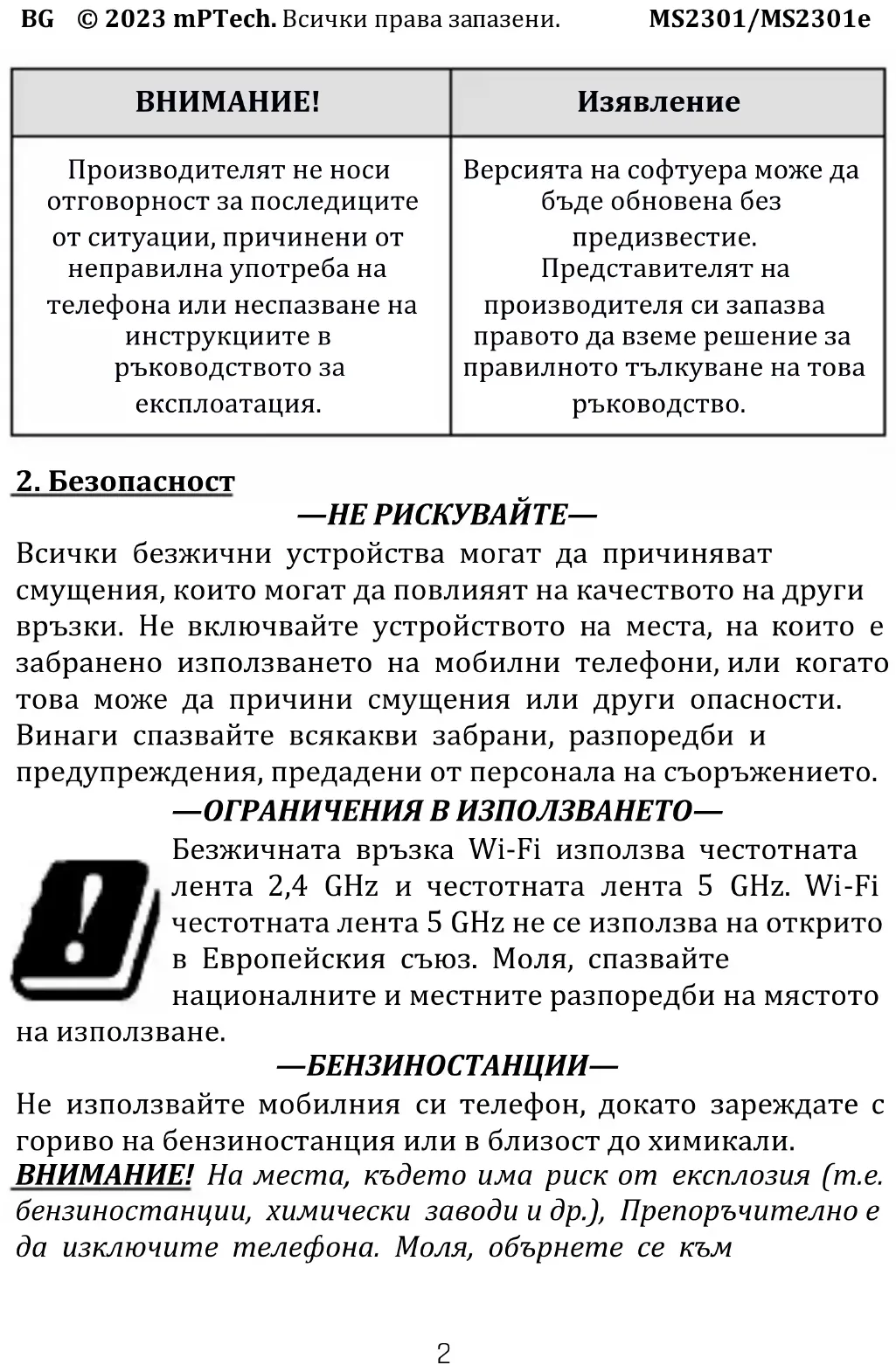 —НЕ РИСКУВАЙТЕ— Всички безжични устройства могат да причиняват смущения, които могат да повлияят на качеството на други връзки. Не включвайте устройството на места, на които е забранено използването на мобилни телефони, или когато това може да причини смущения или други опасности. Винаги спазвайте всякакви забрани, разпоредби и предупреждения, предадени от персонала на съоръжението. —ОГРАНИЧЕНИЯ В ИЗПОЛЗВАНЕТО— Безжичната връзка Wi-Fi използва честотната лента 2,4 GHz и честотната лента 5 GHz. Wi-Fi честотната лента 5 GHz не се използва на открито в Европейския съюз. Моля, спазвайте националните и местните разпоредби на мястото на използване. —БЕНЗИНОСТАНЦИИ— Не използвайте мобилния си телефон, докато зареждате с гориво на бензиностанция или в близост до химикали. ВНИМАНИЕ! На места, където има риск от експлозия (т.е. бензиностанции, химически заводи и др.), Препоръчително е да изключите телефона. Моля, обърнете се къмBG © 2023 mPTech. Всички права запазени. MS2301/MS2301e