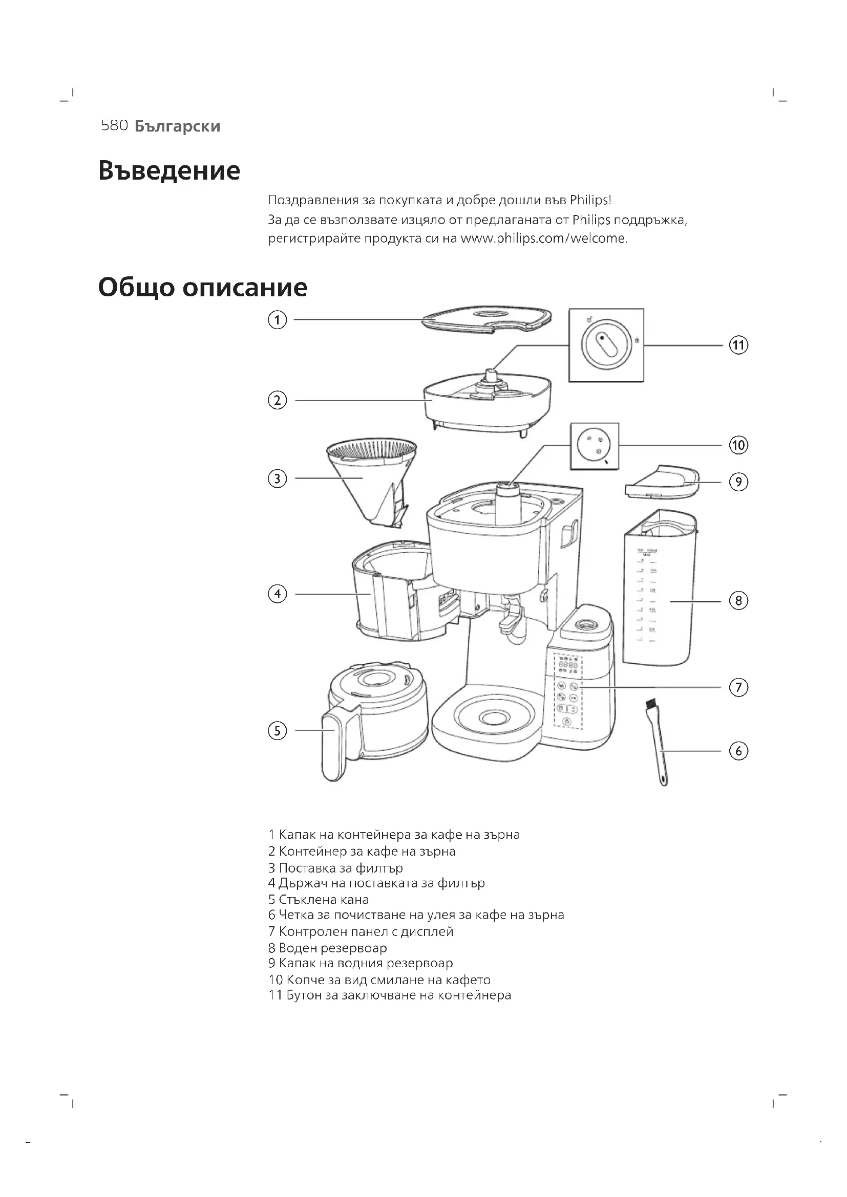 1 Капак на контейнера за кафе на зърна 2 Контейнер за кафе на зърна 3 Поставка за филтър 4 Държач на поставката за филтър 5 Стъклена кана 6 Четка за почистване на улея за кафе на зърна 7 Контролен панел с дисплей 8 Воден резервоар 9 Капак на водния резервоар 10 Копче за вид смилане на кафето 11 Бутон за заключване на контейнера581
