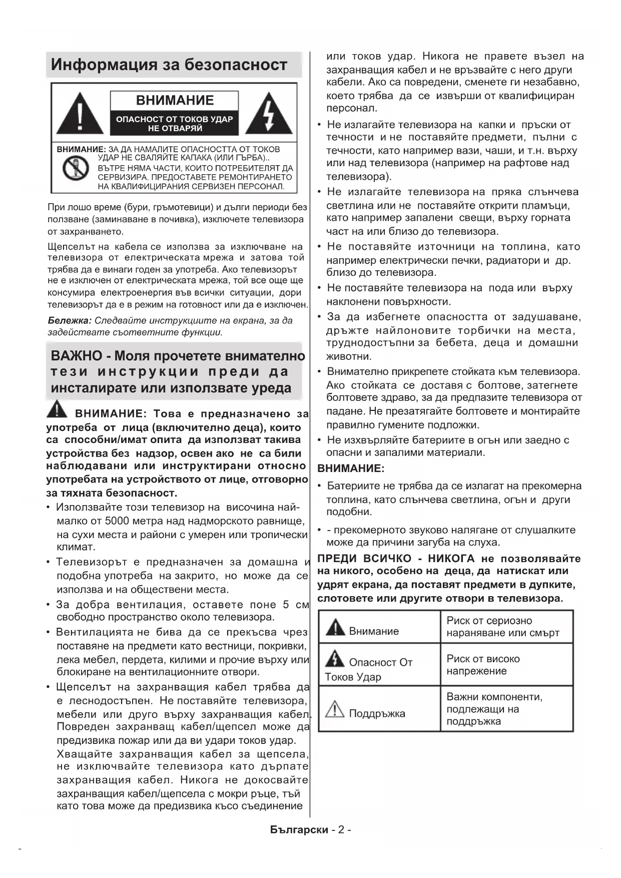 ОПАСНОСТ ОТ ТОКОВ УДАРНЕ ОТВАРЯЙВНИМАНИЕ: ЗА ДА НАМАЛИТЕ ОПАСНОСТТА ОТ ТОКОВ УДАР НЕ СВАЛЯЙТЕ КАПАКА (ИЛИ ГЪРБА).. ВЪТРЕ НЯМА ЧАСТИ, КОИТО ПОТРЕБИТЕЛЯТ ДА СЕРВИЗИРА. ПРЕДОСТАВЕТЕ РЕМОНТИРАНЕТО НА КВАЛИФИЦИРАНИЯ СЕРВИЗЕН ПЕРСОНАЛ.Бележка: Следвайте инструкциите на екрана, за да задействате съответните функции.При лошо време (бури, гръмотевици) и дълги периоди без ползване (заминаване в почивка), изключете телевизора от захранването.Щепселът на кабела се използва за изключване на телевизора от електрическата мрежа и затова той трябва да е винаги годен за употреба. Ако телевизорът не е изключен от електрическата мрежа, той все още ще консумира електроенергия във всички ситуации, дори телевизорът да е в режим на готовност или да е изключен. ВАЖНО - Моля прочетете внимателно тези инструкции преди да инсталирате или използвате уреда ВНИМАНИЕ: Това е предназначено за употреба от лица (включително деца), които са способни/имат опита да използват такива устройства без надзор, освен ако не са били наблюдавани или инструктирани относно употребата на устройството от лице, отговорно за тяхната безопасност.