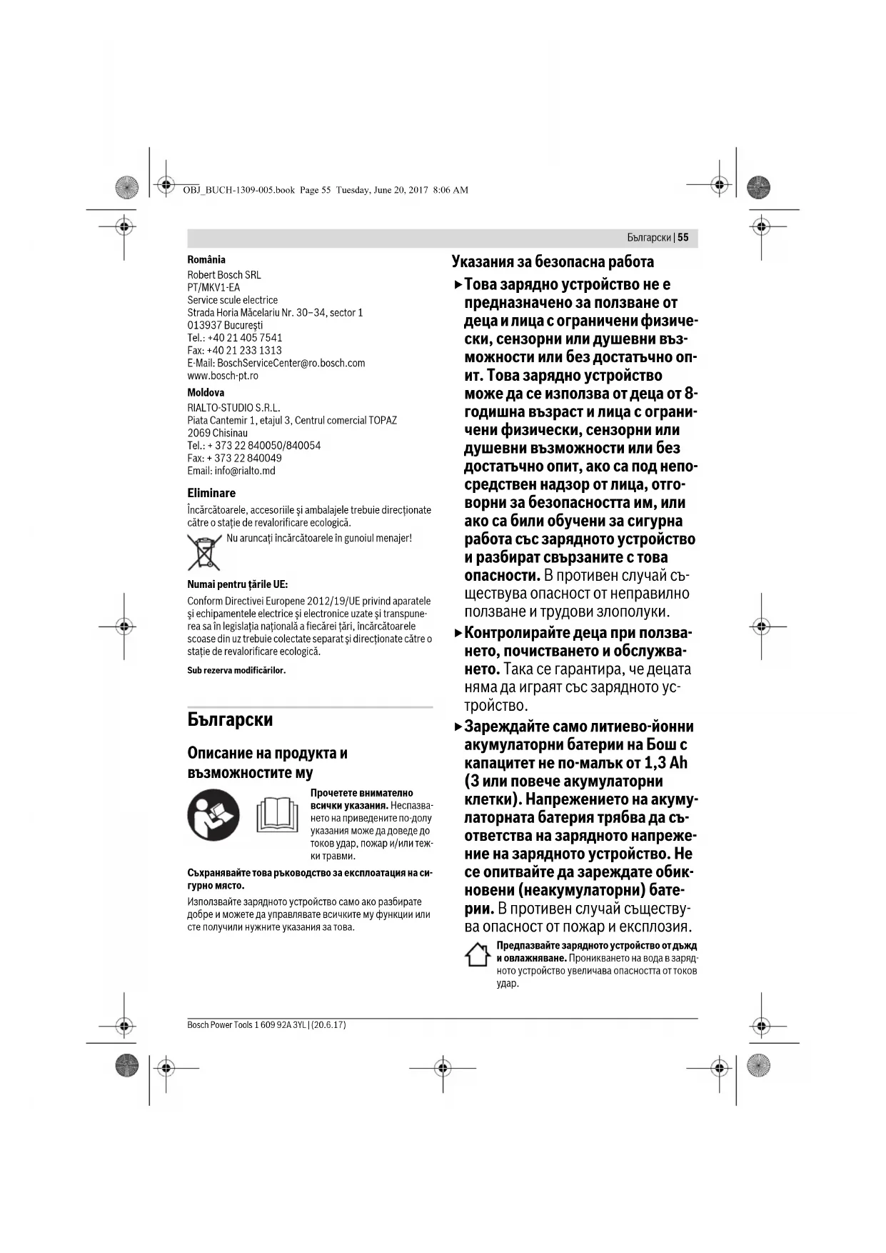 OBJ_BUCH-1309-005.book Page 55 Tuesday, June 20, 2017 8:06 AM56 | Български 1 609 92A 3YL | (20.6.17) Bosch Power Tools Поддържайте зарядното устройство чисто. Същест- вува опасност от възникване на токов удар вследствие на замърсяване на зарядното устройство. Винаги преди употреба проверявайте зарядното ус- тройство, захранващия кабел и щепсела. Не използ- вайте зарядното устройство в случай, че откриете повреди. Не отваряйте зарядното устройство, оста- вете ремонтите да бъдат извършвани само от квали- фицирани техници и с оригинални резервни части. Повреди на зарядното устройство, захранващия кабел или щепсела увеличават опасността от токов удар. Не поставяйте зарядното устройство на леснозапа- лима повърхност (напр. хартия, текстил и др. п.) или в леснозапалима среда. Съществува опасност от въз- никване на пожар вследствие на нагряването на ус- тройството по време на зареждане. При повреждане и неправилна експлоатация от аку- мулаторната батерия могат да се отделят пари. Про- ветрете помещението и, ако се почувствате нераз- положени, потърсете лекарска помощ. Парите могат да раздразнят дихателните пътища. Не покривайте вентилационните отвори на зарядно- то устройство. В противен случай зарядното устрой- ство може да прегрее и да престане да функционира