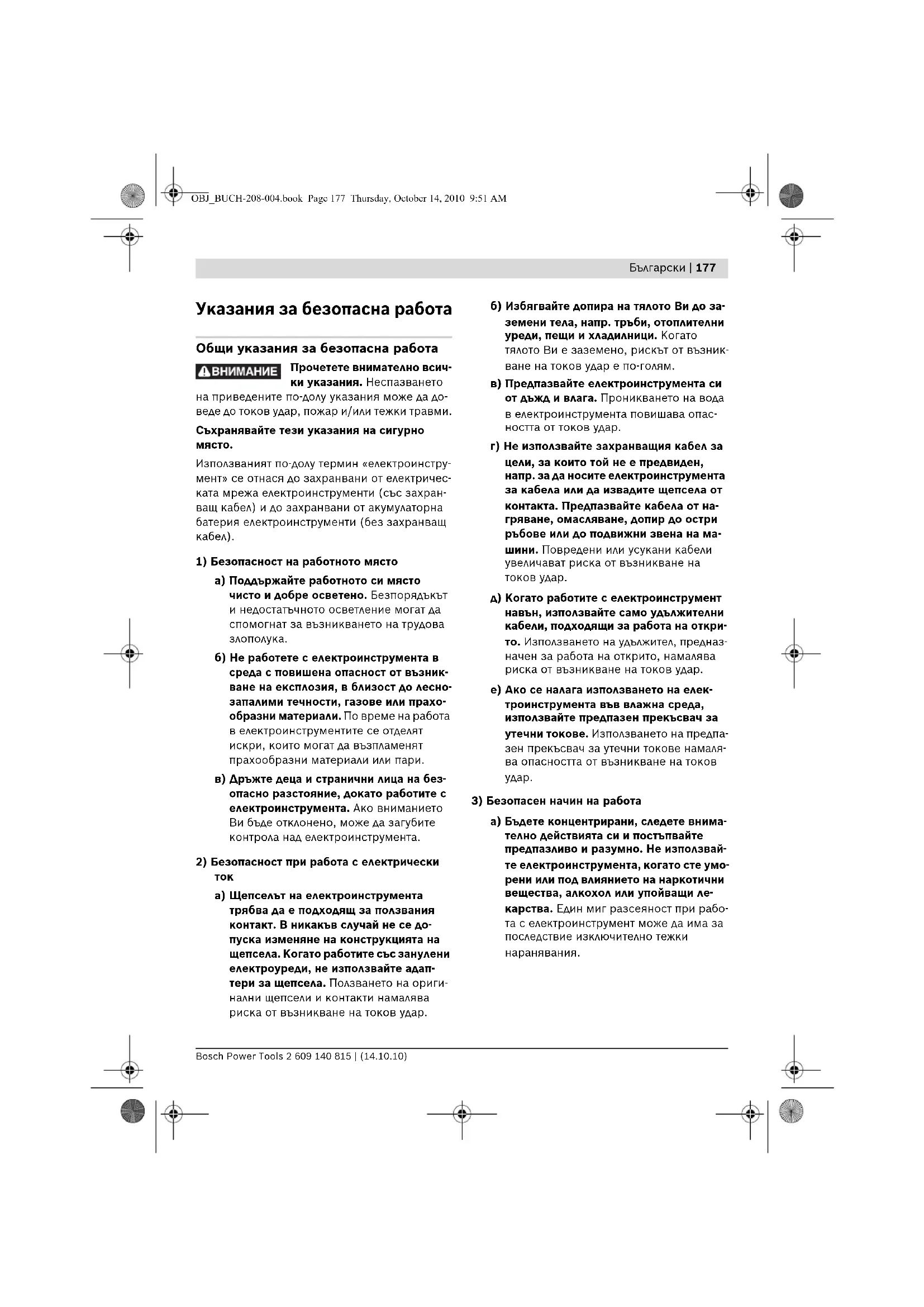 а) Бъдете концентрирани, следете внима- телно действията си и постъпвайте предпазливо и разумно. Не използвай- те електроинструмента, когато сте умо- рени или под влиянието на наркотични вещества, алкохол или упойващи ле- карства. Един миг разсеяност при рабо- та с електроинструмент може да има за последствие изключително тежки наранявания. OBJ_BUCH-208-004.book Page 177 Thursday, October 14, 2010 9:51 AM178 | Български 2 609 140 815 | (14.10.10) Bosch Power Tools б) Работете с предпазващо работно облекло и винаги с предпазни очила. Носенето на подходящи за ползвания електроинструмент и извършваната дей- ност лични предпазни средства, като дихателна маска, здрави плътнозатво- рени обувки със стабилен грайфер, защитна каска или шумозаглушители (антифони), намалява риска от възникване на трудова злополука. в) Избягвайте опасността от включване на електроинструмента по невнима- ние. Преди да включите щепсела в захранващата мрежа или да поставите акумулаторната батерия, се уверявай- те, че пусковият прекъсвач е в положе- ние «изключено». Ако, когато носите електроинструмента, държите пръста си върху пусковия прекъсвач, или ако подавате захранващо напрежение на електроинструмента, когато е включен, съществува опасност от възникване на трудова злополука. г) Преди да включите електроинструмен- та, се уверявайте, че сте отстранили от него всички помощни инструменти и гаечни ключове. Помощен инструмент, забравен на въртящо се звено, може да причини травми. д) Избягвайте неестествените положения на тялото. Работете в стабилно поло- жение на тялото и във всеки момент поддържайте равновесие. Така ще можете да контролирате електроинстру- мента по-добре и по-безопасно, ако възникне неочаквана ситуация. е) Работете с подходящо облекло. Не работете с широки дрехи или украше- ния. Дръжте косата си, дрехите и ръка- вици на безопасно разстояние от вър- тящи се звена на електроинструмен- тите. Широките дрехи, украшенията, дългите коси могат да бъдат захванати и увлечени от въртящи се звена. ж)Ако е възможно използването на външна аспирационна система, се уверявайте, че тя е включена и функ- ционира изправно. Използването на аспирационна система намалява риско- вете, дължащи се на отделящата се при работа прах.