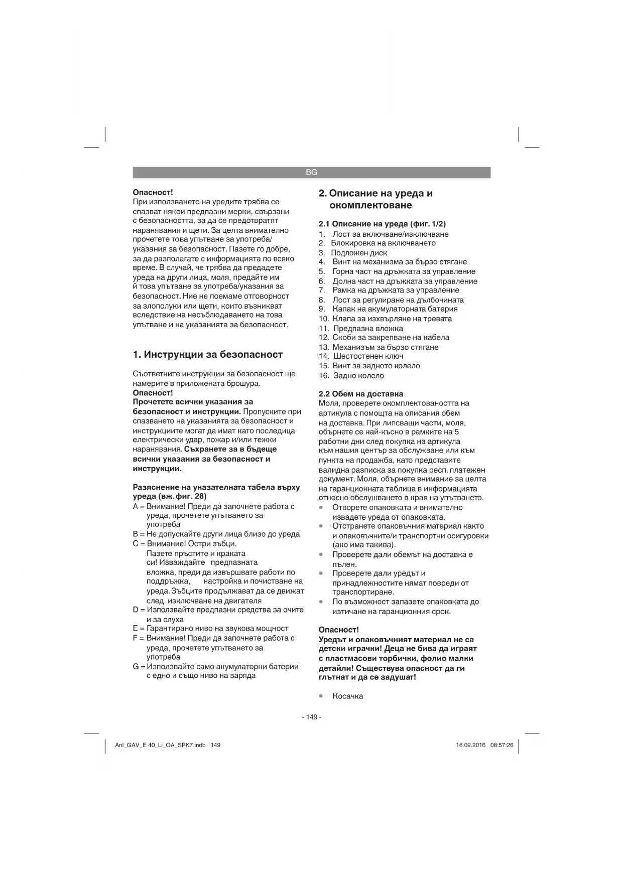Уредът се доставя без акумулаторни батерии и без зарядно устройство и може да се използва само с литиево-йонни акумулаторни Anl_GAV_E 40_Li_OA_SPK7.indb 150Anl_GAV_E 40_Li_OA_SPK7.indb 150 16.09.2016 08:57:2616.09.2016 08:57:26BG
