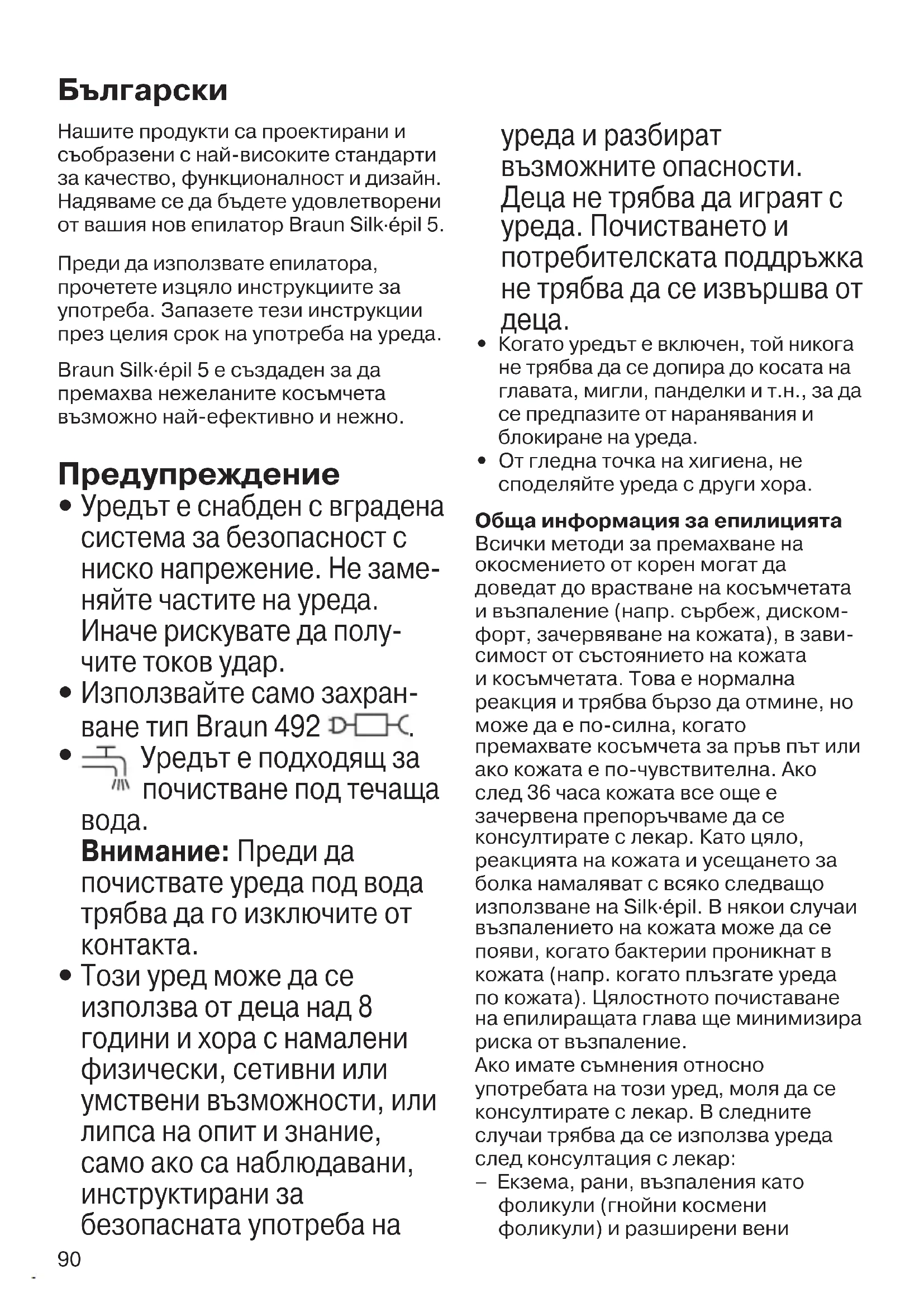 В рамките на гаранционния срок безплатно се отстраняват дефектите в материалите и производството чрез поправка, смяна на части или целия уред, по преценка на сервизния център. Тази гаранция се признава във всички страни, където Braun и неговият изключителен дистрибутор продават този уред и няма ограничение за внос или официална разпоредба не забранява да се извърши предвиденото гаранционно обслужване. Гаранцията не покрива: повреди от неправилна употреба (работа при неподходящо напрежение, включване в неподходящ източник на електрически ток, счупване); износване и незначителни дефекти, които не пречат на нормалната работа на уреда. Гаранцията не се признава при поправка на уреда от неоторизирани лица или ако не са използвани оригинални резервни части на Braun. Гаранцията е валидна при правилно попълнени: дата на покупката, печат и подпис в гаранцион-ната карта. За всички рекламации, възникнали в гаранционния срок, изпратете уреда както и гаранционната му карта в най-близкия сервиз на Braun. За справки 0800 11 003 – национален телефон на БГ сервиз без увеличение на телефонната услуга или www.bgs.bg. 90340813_SE5_Power_MN.indd 9390340813_SE5_Power_MN.indd 93 02.06.22 10:4902.06.22 10:4994 Руководство по эксплуатации Наша продукция отвечает самым высоким стандартам качества, функ- циональности и дизайна. Надеемся, Вы в полной мере будете довольны Вашим новым приобретением – эпилятором Braun Silk·épil 5. Прежде, чем приступить к работе с этим прибором, пожалуйста, внима- тельно прочитайте данное руковод- ство по эксплуатации. Braun Silk·épil 5 делает удаление нежелательных волосков максимально эффективным, мягким и простым.