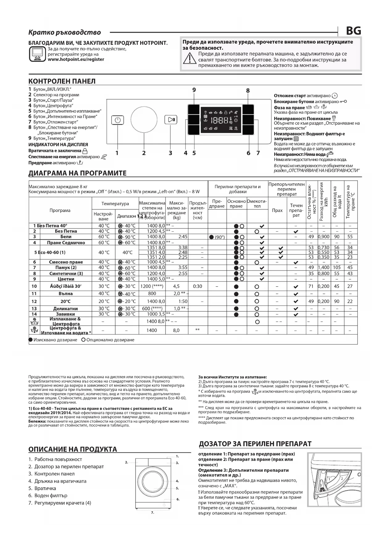 Кратко ръководство Преди да използвате уреда, прочетете внимателно инструкциите за безопасност. Преди да използвате пералната машина, е задължително да се свалят транспортните болтове. За по-подробни инструкции за премахването им вижте ръководството за монтаж. БЛАГОДАРИМ ВИ, ЧЕ ЗАКУПИХТЕ ПРОДУКТ HOTPOINT. За да получите по-пълно съдействие, регистрирайте уреда на www.hotpoint.eu/register