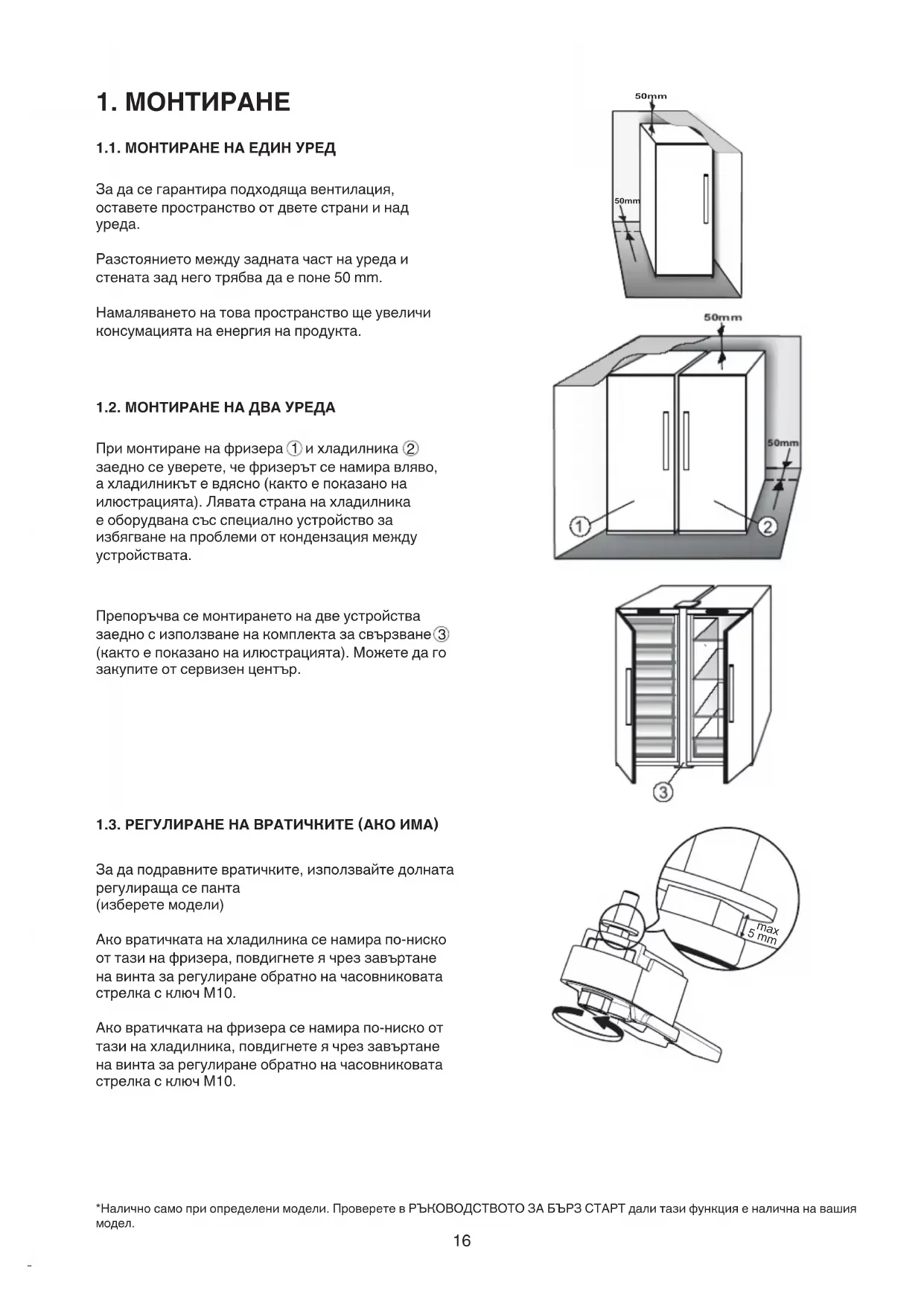 Разстояниетомеждузаднатачастнауредаи стенатазаднеготрябвадаепоне50mm. Намаляванетонатовапространствощеувеличи консумациятанаенергиянапродукта. 1.2. МОНТИРАНЕ НА ДВА УРЕДА Примонтираненафризера