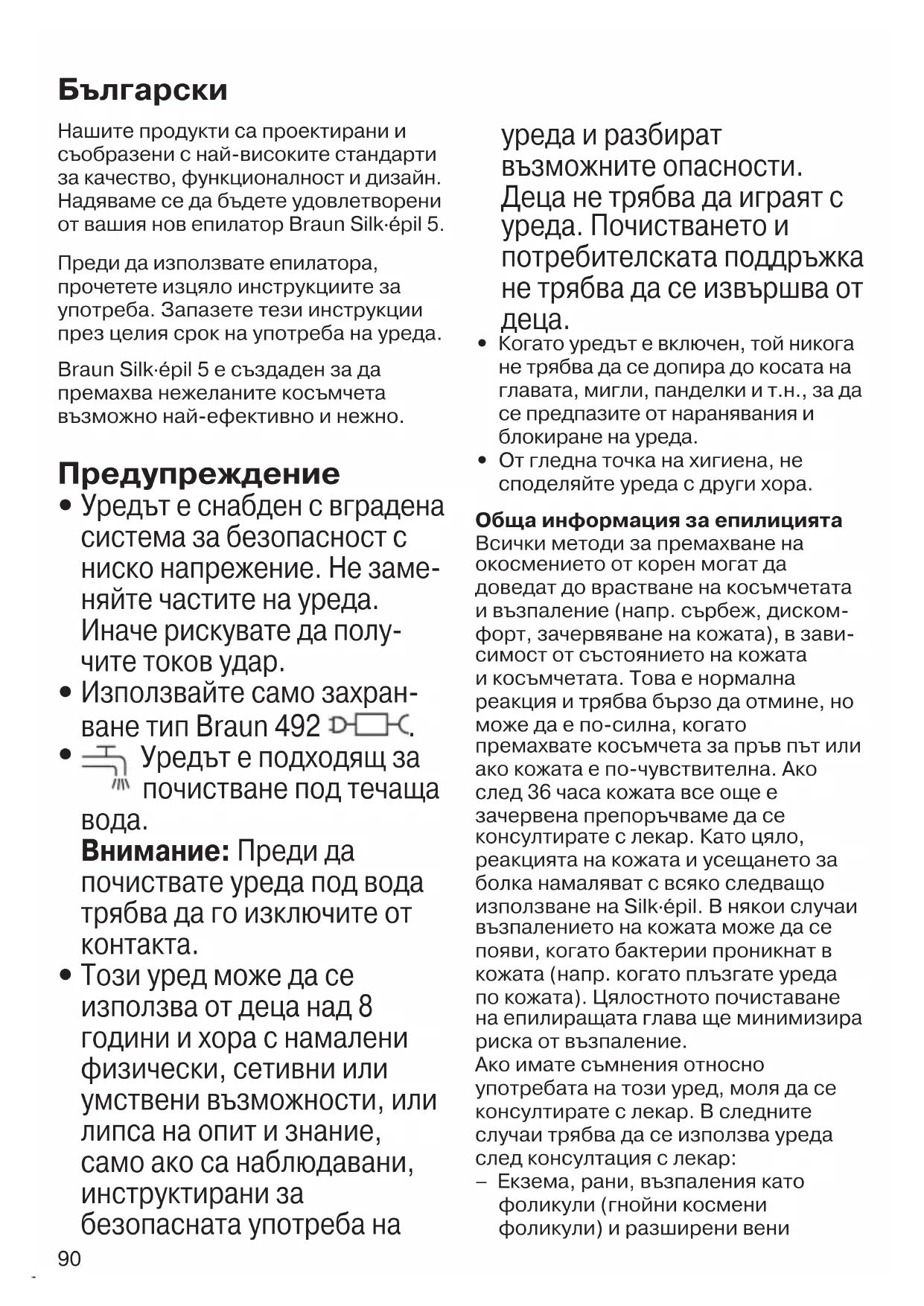 В рамките на гаранционния срок безплатно се отстраняват дефектите в материалите и производството чрез поправка, смяна на части или целия уред, по преценка на сервизния център. Тази гаранция се признава във всички страни, където Braun и неговият изключителен дистрибутор продават този уред и няма ограничение за внос или официална разпоредба не забранява да се извърши предвиденото гаранционно обслужване. Гаранцията не покрива: повреди от неправилна употреба (работа при неподходящо напрежение, включване в неподходящ източник на електрически ток, счупване); износване и незначителни дефекти, които не пречат на нормалната работа на уреда. Гаранцията не се признава при поправка на уреда от неоторизирани лица или ако не са използвани оригинални резервни части на Braun. Гаранцията е валидна при правилно попълнени: дата на покупката, печат и подпис в гаранцион-ната карта. За всички рекламации, възникнали в гаранционния срок, изпратете уреда както и гаранционната му карта в най-близкия сервиз на Braun. За справки 0800 11 003 – национален телефон на БГ сервиз без увеличение на телефонната услуга или www.bgs.bg. 90340813_SE5_Power_MN.indd 9390340813_SE5_Power_MN.indd 93 02.06.22 10:4902.06.22 10:4994 Руководство по эксплуатации Наша продукция отвечает самым высоким стандартам качества, функ- циональности и дизайна. Надеемся, Вы в полной мере будете довольны Вашим новым приобретением – эпилятором Braun Silk·épil 5. Прежде, чем приступить к работе с этим прибором, пожалуйста, внима- тельно прочитайте данное руковод- ство по эксплуатации. Braun Silk·épil 5 делает удаление нежелательных волосков максимально эффективным, мягким и простым.
