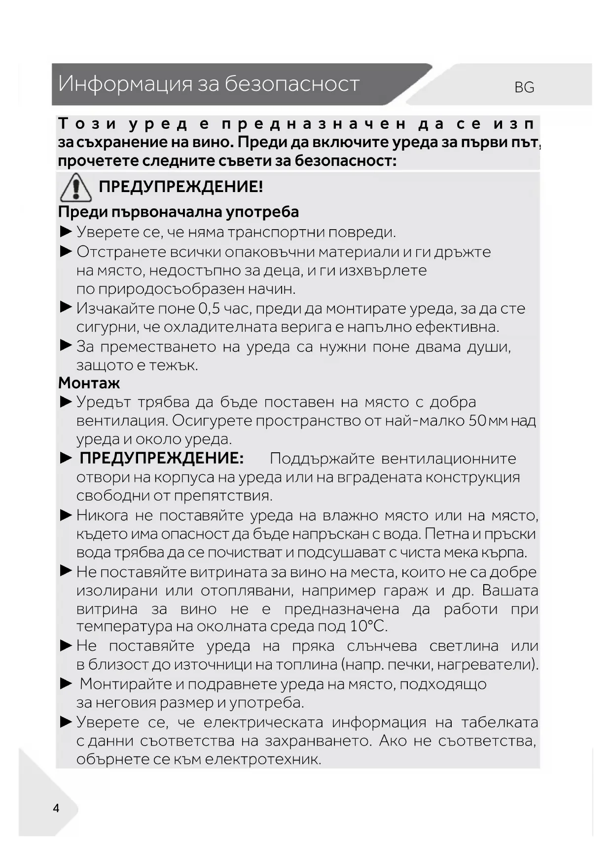 ни или отоплявани, например гараж и др. Вашата витрина за вино не е предназначена да работи при температура на околната среда под 10°C.