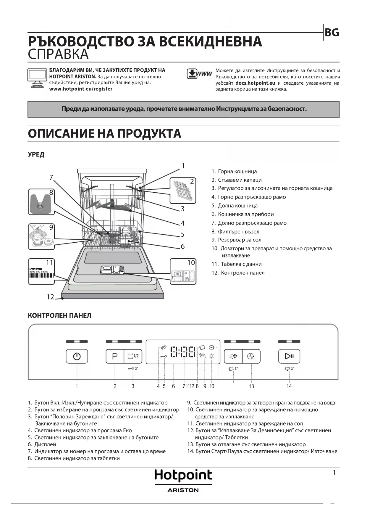 ОПИСАНИЕ НА ПРОДУКТА БЛАГОДАРИМ ВИ, ЧЕ ЗАКУПИХТЕ ПРОДУКТ НА HOTPOINT ARISTON. За да получавате по-пълно съдействие, регистрирайте Вашия уред на: www.hotpoint.eu/register Можете да изтеглите Инструкциите за безопасност и Ръководството за потребителя, като посетите нашия уебсайт docs.hotpoint.eu и следвате указанията на задната корица на тази книжка.1. Горна кошница 2. Сгъваеми капаци3. Регулатор за височината на горната кошница4. Горно разпръскващо рамо5. Долна кошница6. Кошничка за прибори7. Долно разпръскващо рамо8. Филтърен възел9. Резервоар за сол10. Дозатори за препарат и помощно средство за изплакване11. Табелка с данни12. Контролен панел РЪКОВОДСТВО ЗА ВСЕКИДНЕВНА