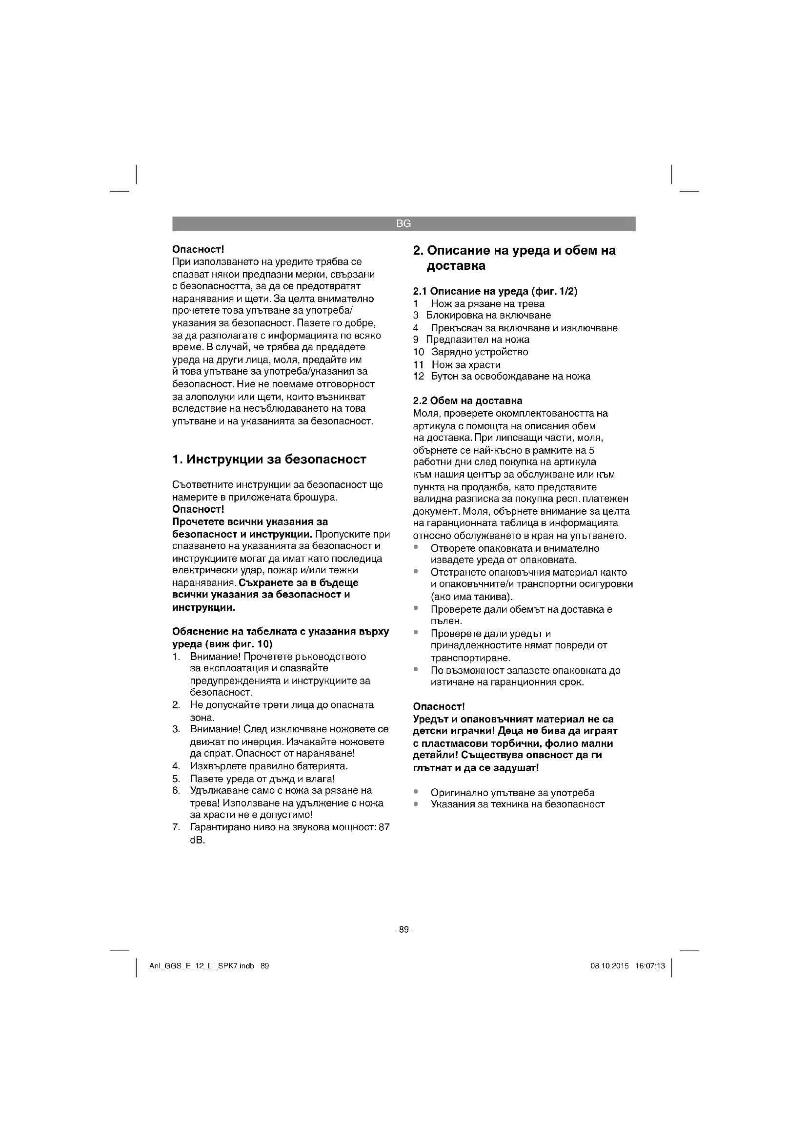отстраняване и рециклиране Уредът е опакован с цел предотвратяване на повреди при транспортирането. Опаковка е суровина и може да се използва отново или да се преработи. Уредът и принадлежностите му се състоят от различни материали, например метал и пластмаса. Не изхвърляйте повредените уреди заедно с битовите отпадъци. Трябва да предадете уреда в подходящ приемен пункт, където уредът ще бъде унищожен съобразно изискванията. Ако не знаете къде има приемен пункт, можете да получите информация в общината. Anl_GGS_E_12_Li_SPK7.indb 92Anl_GGS_E_12_Li_SPK7.indb 92 08.10.2015 16:07:1308.10.2015 16:07:13BG
