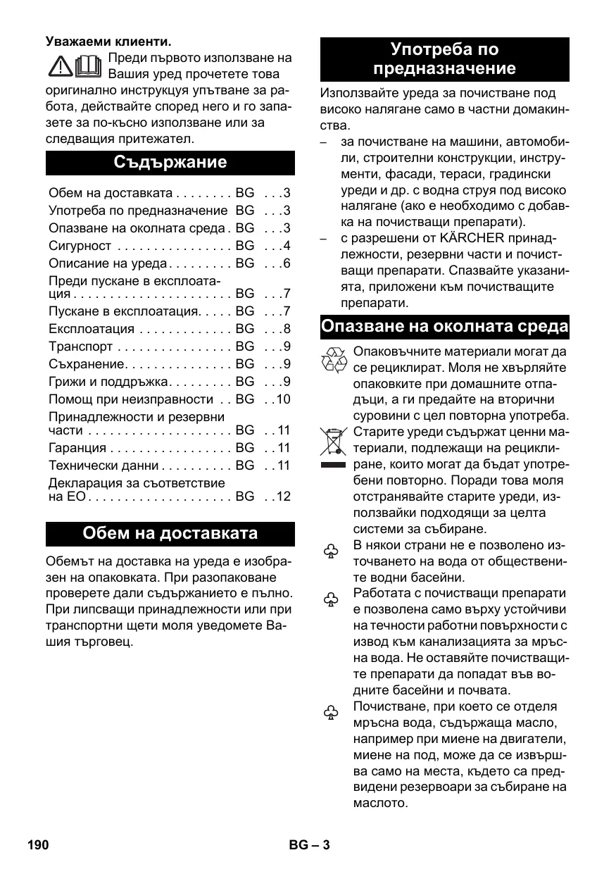Употреба по предназначение Използвайте уреда за почистване под високо налягане само в частни домакинства. – за почистване на машини, автомобили, строителни конструкции, инструменти, фасади, тераси, градински уреди и др. с водна струя под високо налягане (ако е необходимо с добавка на почистващи препарати). – с разрешени от KÄRCHER принадлежности, резервни части и почистващи препарати. Спазвайте указанията, приложени към почистващите