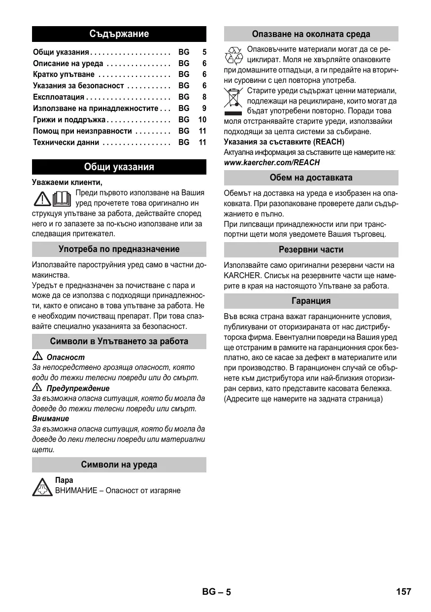 Общи указания Опаковъчните материали могат да се рециклират. Моля не хвърляйте опаковките при домашните отпадъци, а ги предайте на вторични суровини с цел повторна употреба. Старите уреди съдържат ценни материали, подлежащи на рециклиране, които могат да бъдат употребени повторно. Поради това моля отстранявайте старите уреди, използвайки подходящи за целта системи за събиране. Указания за съставките (REACH) Актуална информация за съставките ще намерите на: www.kaercher.com/REACH Обем на доставката Уважаеми клиенти, Преди първото използване на Вашия уред прочетете това оригинално ин струкцуя упътване за работа, действайте според него и го запазете за по-късно използване или за следващия притежател. Обемът на доставка на уреда е изобразен на опаковката. При разопаковане проверете дали съдържанието е пълно. При липсващи принадлежности или при транспортни щети моля уведомете Вашия търговец. Употреба по предназначение Резервни части Използвайте пароструйния уред само в частни домакинства. Уредът е предназначен за почистване с пара и може да се използва с подходящи принадлежности, както е описано в това упътване за работа. Не е необходим почистващ препарат. При това спазвайте специално указанията за безопасност. Използвайте само оригинални резервни части на KARCHER. Списък на резервните части ще намерите в края на настоящото Упътване за работа. Символи в Упътването за работа