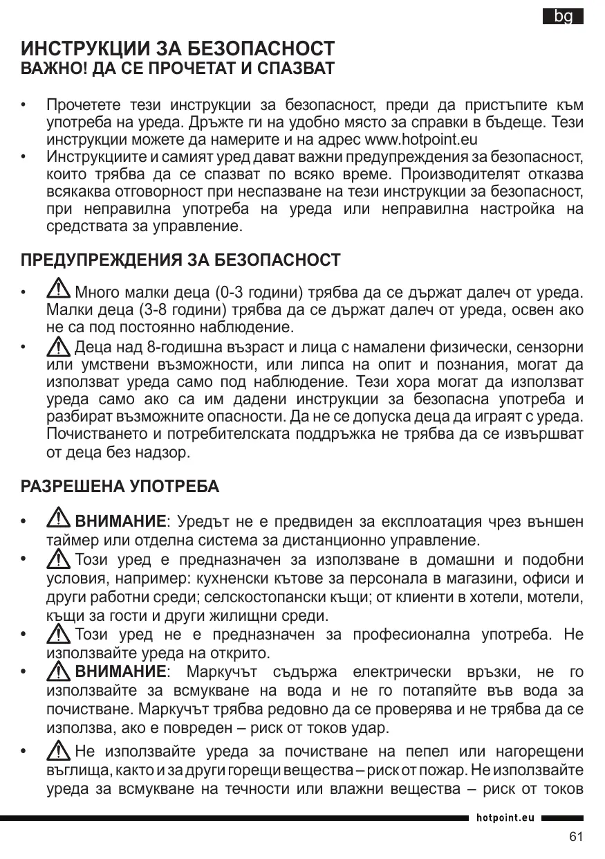 - Перацьогием пибopa почиайтешпсукши по Тхике бezорachoctи. С氧разних дя срравки в уdуншем. Инстукши по Тхике доctунны на calte www.hotpoint.eu.