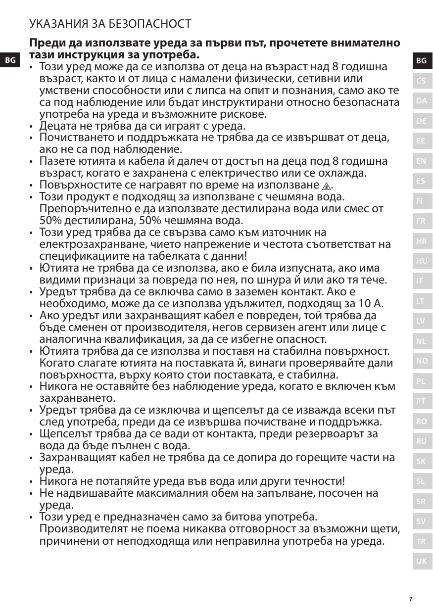 Преди да използвате уреда за първи път, прочетете внимателно тази инструкция за употреба. • Този уред може да се използва от деца на възраст над 8 годишна възраст, както и от лица с намалени физически, сетивни или умствени способности или с липса на опит и познания, само ако те са под наблюдение или бъдат инструктирани относно безопасната употреба на уреда и възможните рискове. • Децата не трябва да си играят с уреда. • Почистването и поддръжката не трябва да се извършват от деца, ако не са под наблюдение. • Пазете ютията и кабела й далеч от достъп на деца под 8 годишна възраст, когато е захранена с електричество или се охлажда. • Повърхностите се награвят по време на използване . • Този продукт е подходящ за използване с чешмяна вода. Препоръчително е да използвате дестилирана вода или смес от 50% дестилирана, 50% чешмяна вода. • Този уред трябва да се свързва само към източник на електрозахранване, чието напрежение и честота съответстват на спецификациите на табелката с данни! • Ютията не трябва да се използва, ако е била изпусната, ако има видими признаци за повреда по нея, по шнура й или ако тя тече. • Уредът трябва да се включва само в заземен контакт. Ако е необходимо, може да се използва удължител, подходящ за 10 А. • Ако уредът или захранващият кабел е повреден, той трябва да бъде сменен от производителя, негов сервизен агент или лице с аналогична квалификация, за да се избегне опасност. • Ютията трябва да се използва и поставя на стабилна повърхност. Когато слагате ютията на поставката й, винаги проверявайте дали повърхността, върху която стои поставката, е стабилна. • Никога не оставяйте без наблюдение уреда, когато е включен към захранването. • Уредът трябва да се изключва и щепселът да се изважда всеки път след употреба, преди да се извършва почистване и поддръжка. • Щепселът трябва да се вади от контакта, преди резервоарът за вода да бъде пълнен с вода. • Захранващият кабел не трябва да се допира до горещите части на уреда. • Никога не потапяйте уреда във вода или други течности! • Не надвишавайте максималния обем на запълване, посочен на уреда. • Този уред е предназначен само за битова употреба. Производителят не поема никаква отговорност за възможни щети, причинени от неподходяща или неправилна употреба на уреда.