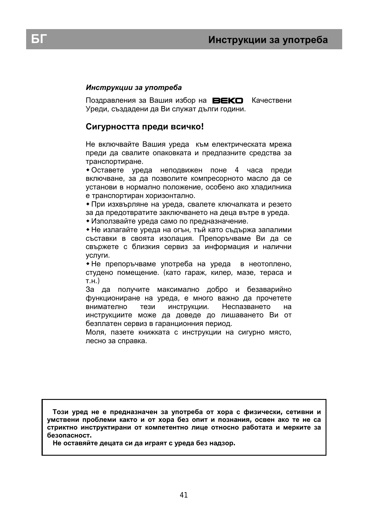 Безопасност преди всичко /41 Електрически изисквания /42 Tранспортнu uнструкции /42 Инструкции при инсталиране /42 Запознаване с вашия уред /43 Препоръки при подреждане на храната /43 Контрол на температурата и настройки /44 Преди работа /44 Съхранение на замразени храни /44 Замразяване на свежи продукти /45; Лед /45 Размразяване /45 Подмяна на лампичката от вътрешното осветление /46 Почистване и грижи /46 Промяна посоката на отваряне на вратата /47 Полезни съвети /47 Разрешение на проблеми /48 Технически характеристики /48