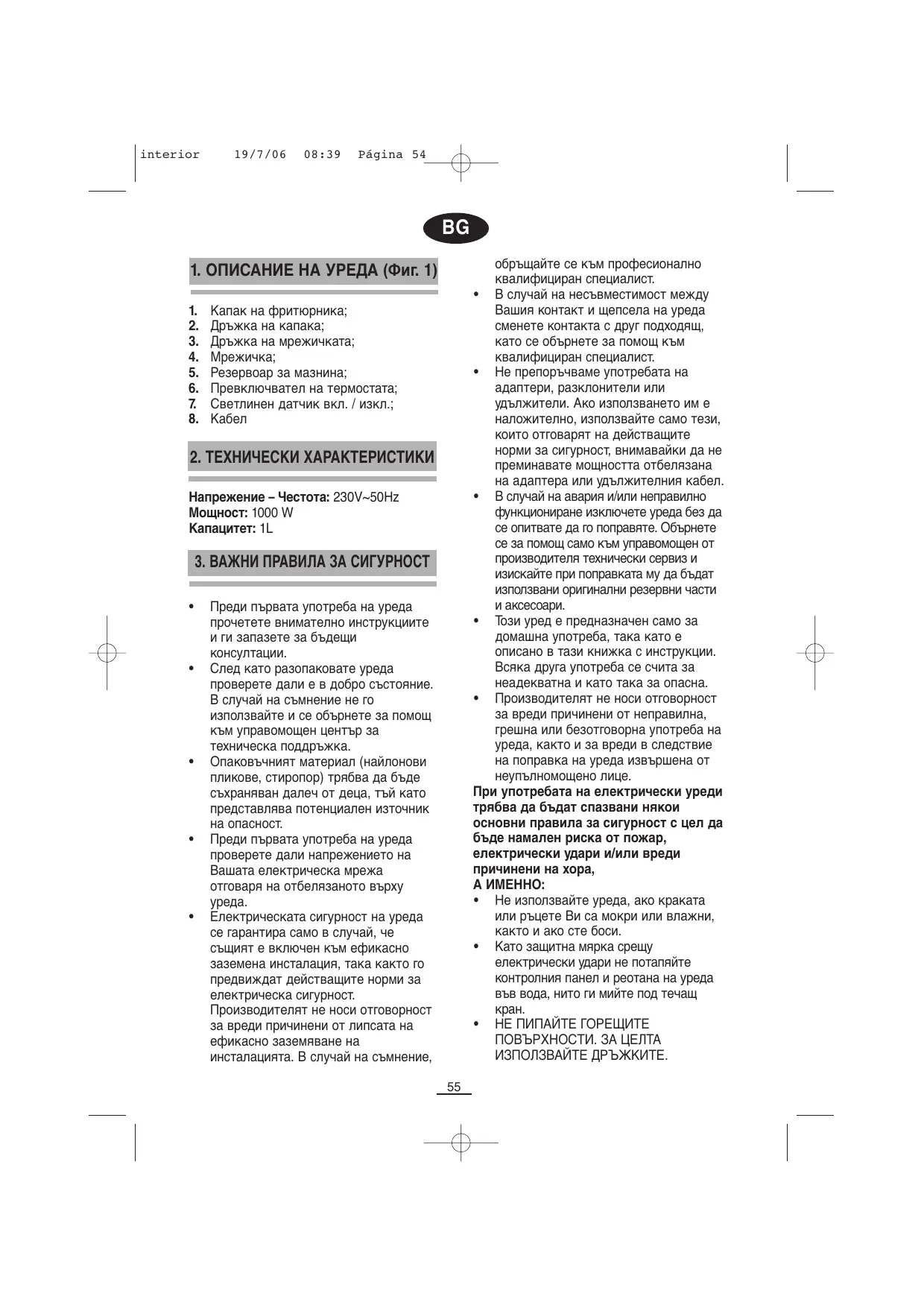 ВНИМАНИЕ! ПО ВРЕМЕ НА РАБОТА ФРИТЮРНИКЪТ ДОСТИГА ДО МНОГО ВИСОКИ ТЕМПЕРАТУРИ. НЕОБХОДИМО Е ДА ВЗИМАТЕ МЕРКИ, ЗА ДА ИЗБЕГНЕТЕ РИСКА ОТ ИЗГАРЯНИЯ, ПОЖАРИ ИЛИ ДРУГИ ВЪЗМОЖНИ ВРЕДИ НА ХОРА НЕ МЕСТЕТЕ УРЕДА ДОКАТО РАБОТИ ИЛИ ДОКАТО ИЗСТИВА Не забразяйте, че мазните могат да се разградят или дори запалят при продължителното им загряване до високи температури. В случай на запалване изключете незабавно уреда и поставете капака, за да задушите пламъка. За Вашата сигурност никога не използвайте Изключвайте уреда, когато не го използвате или преди неговото почистване или поддръжка. За да изключите уреда е необходимо първо да поставите превключвателя в позиция "0", след което да го изключите от контакта. Никога не оставяйте работещия уред без надзор. Изключвайте го дори и когато ще отсъствате за кратко. Изчаквайте мазнината да изстине преди почистване или съхранение на Не използвайте уреда ако захранващият му кабел или щепселът му са повредени, както и в случай на авария или неправилно функциониране. Проверявайте редовно дали захранващият кабел се намира в добро състояние. Потребителят на този уред не трябва да се опитва да сменя захранващия му кабел. В случай, че същият е повреден или е необходимо да бъде сменен обръщайте се единствено към управомощен от производителя сервиз за техническа поддръжка за неговия преглед и смяна. Не оставяйте кабела да виси от края на масата или кухненския плот, както и да влиза в контакт с горещи повърхности.