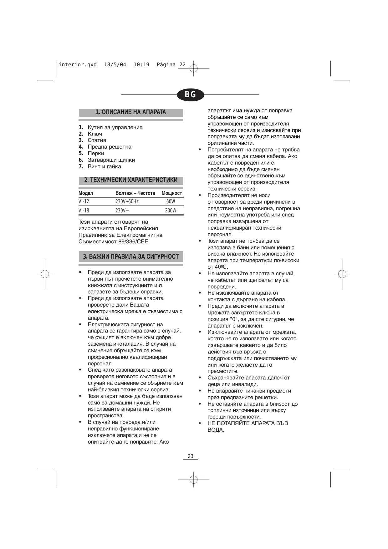 апаратът има нужда от поправка обръщайте се само към управомощен от производителя технически сервиз и изисквайте при поправката му да бъдат използвани оригинални части. Потребителят на апарата не трябва да се опитва да сменя кабела. Ако кабелът е повреден или е необходимо да бъде сменен обръщайте се единствено към управомощен от производителя технически сервиз. Производителят не носи отговорност за вреди причинени в следствие на неправилна, погрешна или неуместна употреба или след поправка извършена от неквалифициран технически Този апарат не трябва да се използва в бани или помещения с висока влажност. Не използвайте апарата при температури по-високи от 40ºC. Не използвайте апарата в случай, че кабелът или щепселът му са Не изключвайте апарата от контакта с дърпане на кабела. Преди да включите апарата в мрежата завъртете ключа в позиция "0", за да сте сигурни, че апаратът е изключен. Изключвайте апарата от мрежата, когато не го използвате или когато извършвате каквито и да било действия във връзка с поддръжката или почистването му или когато желаете да го преместите. Съхранявайте апарата далеч от деца или инвалиди. Не вкарвайте никакви предмети през предпазните решетки. Не оставяйте апарата в близост до топлинни източници или върху горещи повърхности. НЕ ПОТАПЯЙТЕ АПАРАТА ВЪВ