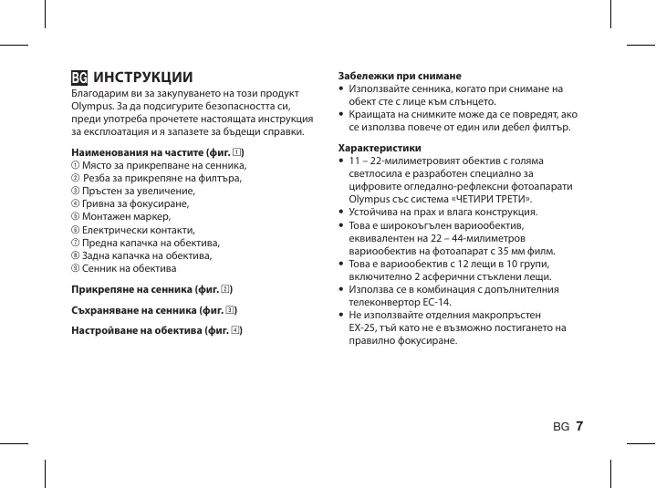 ZUIKO DIGITAL 11-22 MM 1:2.8-3.5 - Фотообектив OLYMPUS - Notice d'utilisation et mode d'emploi gratuit