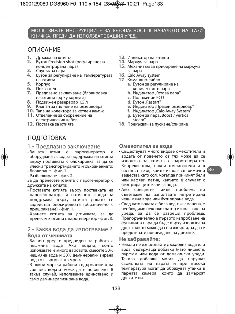16. Calc Away system 17 Командно табло a. Бутон за регулиране на количеството пара b. Индикатор „Готова пара" c. Положение ЕСО d. Бутон „Restart" e. Индикатор „Празен резервоар" f. Индикатор „Calc-Away System" g. Бутон за пара „Boost / vertical steam” 18. Прекъсвач за пускане/спиране