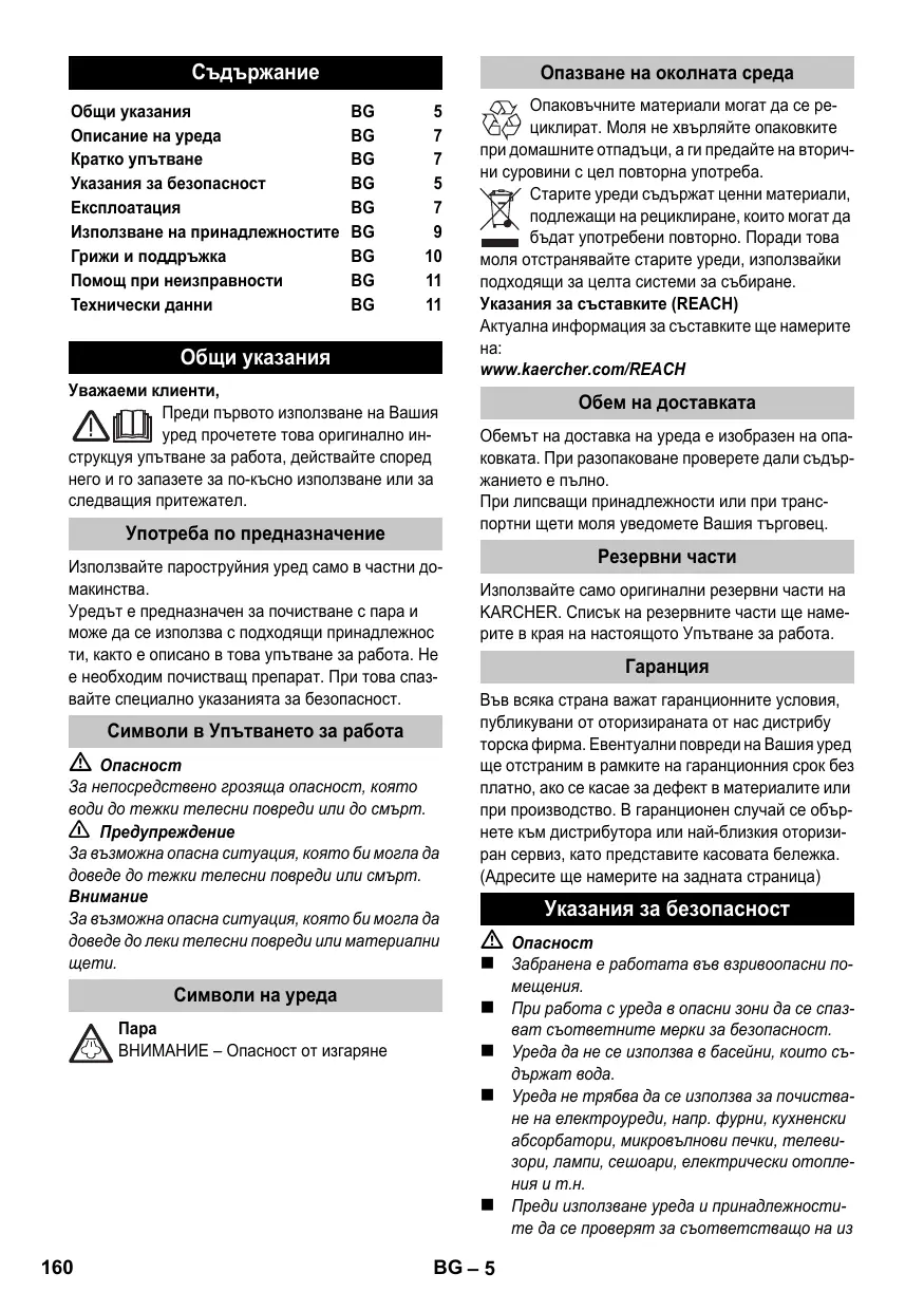 За непосредствено грозяща опасност, която води до тежки телесни повреди или до смърт. 몇 Предупреждение За възможна опасна ситуация, която би могла да доведе до тежки телесни повреди или смърт. За възможна опасна ситуация, която би могла да доведе до леки телесни повреди или материални Символи на уреда ВНИМАНИЕ – Опасност от изгаряне Опаковъчните материали могат да се рециклират. Моля не хвърляйте опаковките при домашните отпадъци, а ги предайте на вторични суровини с цел повторна употреба. Старите уреди съдържат ценни материали, подлежащи на рециклиране, които могат да бъдат употребени повторно. Поради това моля отстранявайте старите уреди, използвайки подходящи за целта системи за събиране. Указания за съставките (REACH) Актуална информация за съставките ще намерите www.kaercher.com/REACH Обем на доставката Обемът на доставка на уреда е изобразен на опаковката. При разопаковане проверете дали съдържанието е пълно. При липсващи принадлежности или при транспортни щети моля уведомете Вашия търговец. Резервни части Използвайте само оригинални резервни части на KARCHER. Списък на резервните части ще намерите в края на настоящото Упътване за работа.