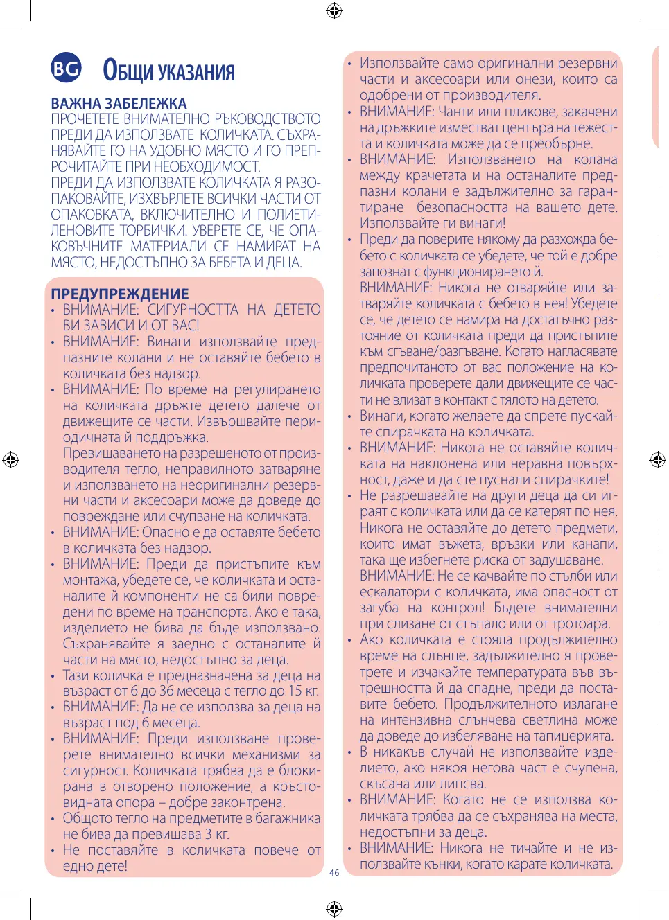 • AVERTISSEMENT : ne pas utilisier ce produit en faisant du jogging ou des promenadesen rollers. • Éviter le contact de la poussette avec de l’eau salée afin de prévenir la formation de rouille. • Ne pas utiliser la poussette à la plage. • AVERTISSEMENT : ce produit doit être utilisé uniquement par un adulte.